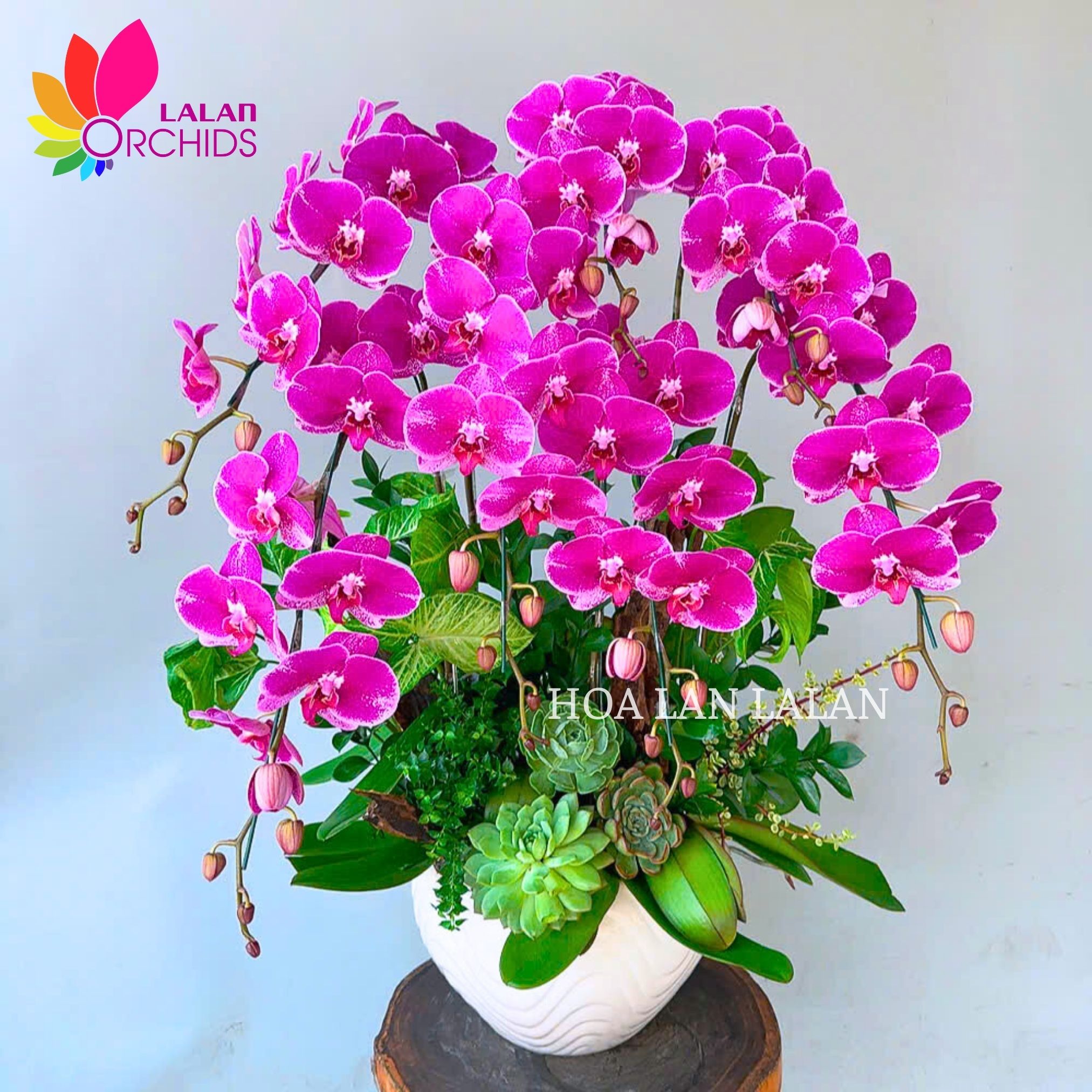 Lan hồ điệp được mệnh danh là "nữ hoàng của các loài hoa" với những đường nét mềm mại, duyên dáng và tươi lâu. Màu tím của 7 cành lan hồ điệp trong chậu biểu trưng cho sự thanh lịch, quyến rũ và bí ẩn. Đây là gam màu thể hiện sự thịnh vượng, phù hợp với những người yêu thích vẻ đẹp tao nhã, tinh tế. Sen đá, với sức sống bền bỉ và hình dáng độc đáo, góp phần mang lại cảm giác vững chãi, mạnh mẽ. Khi mix cùng lan hồ điệp tím, sen đá trở thành điểm nhấn độc đáo cho chậu hoa, tạo sự cân bằng hoàn hảo giữa vẻ đẹp nhẹ nhàng và khỏe khoắn.