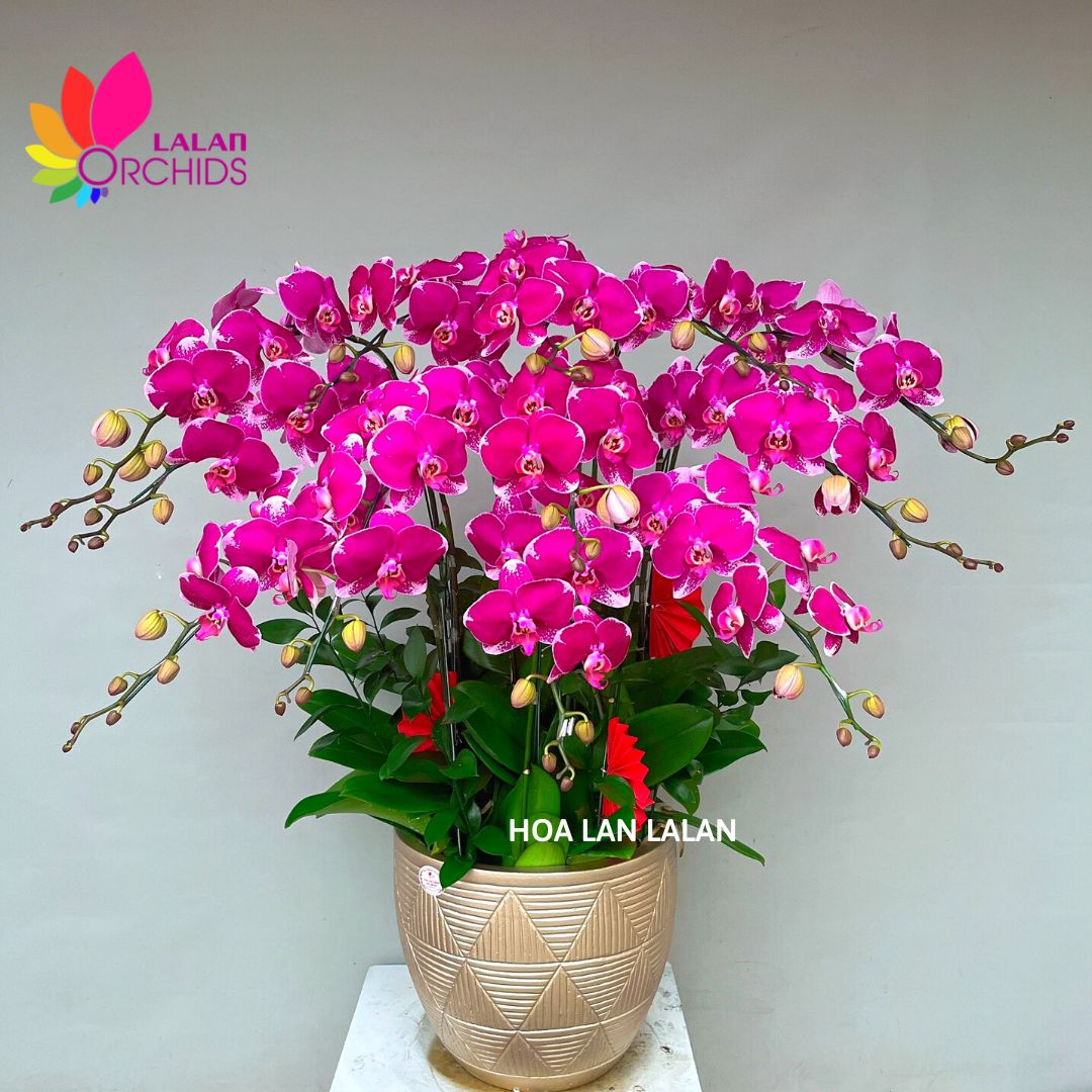 Lan hồ điệp tím đột biến 12 cành ghép từ những cành hoa lan chất lượng loại A với đặc điểm bông to, cành dài, siêu bền, được các nghệ nhân của Hoa lan Lalan ghép xen kẽ một cách hài hòa, nghệ thuật tạo nên chậu hoa lan đẹp sang trọng, quý phái và tinh tế.