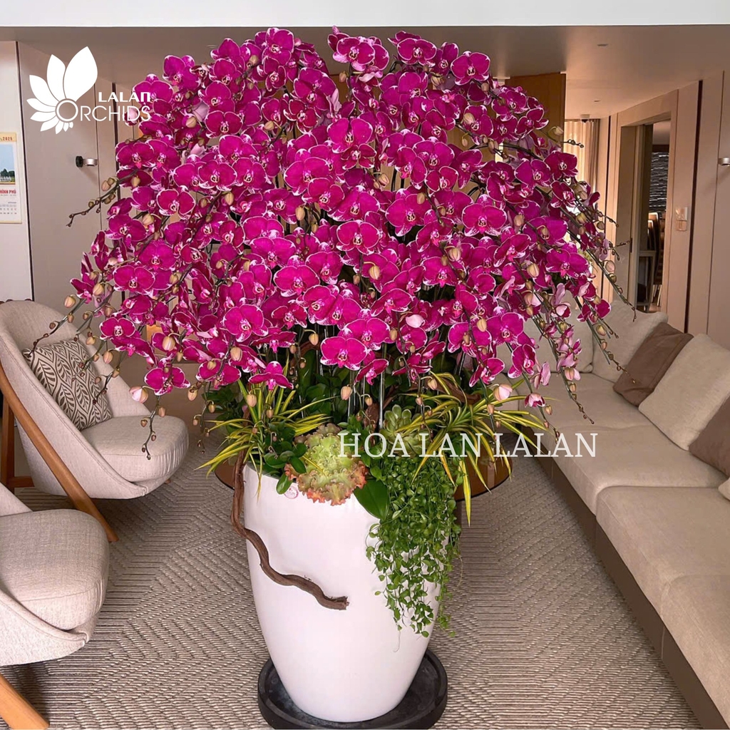 Lan hồ điệp được Lalan tuyển chọn kỹ lưỡng từ những cây khỏe mạnh, cành hoa dài, độ bền vượt trội, giữ sắc tươi suốt nhiều tuần. Hoa nở chuẩn dịp, màu ổn định, không phai, mang lại giá trị trưng bày lâu dài trong suốt mùa Tết và các sự kiện quan trọng. Sự kết hợp giữa lan hồ điệp tím đột biến và thiết kế chậu cao cấp tạo nên tổng thể sang trọng, hài hòa, xứng tầm không gian biệt thự, sảnh công ty, văn phòng lãnh đạo hay showroom cao cấp.