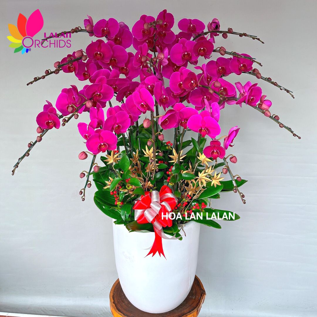 Chậu lan hồ điệp tím mừng khai trương được ghép từ 15 cành hoa lan chất lượng loại A với đặc điểm bông to, cành dài, siêu bền, được các nghệ nhân của Hoa lan Lalan ghép xen kẽ một cách hài hòa, nghệ thuật tạo nên chậu hoa lan đẹp sang trọng, quý phái và tinh tế.