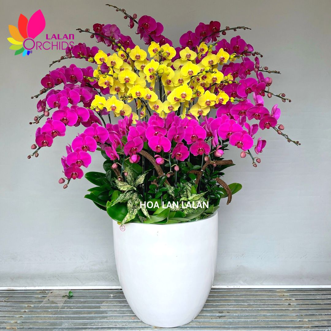 Lan hồ điệp trắng vàng được ghép từ 30 cành lan hồ điệp, do các nghệ nhân của Hoa lan Lalan ghép xen kẽ một cách hài hòa từ hai màu lan hồ diệp tím với vẻ đẹp sang trọng và quý phái, lan hồ điệp vàng rực rỡ, ấp cúng.