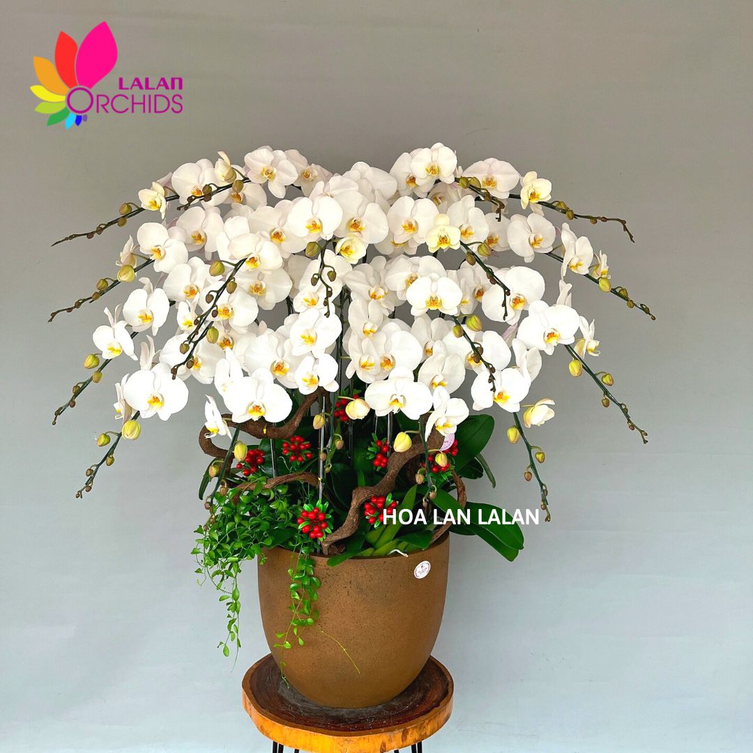 Chậu lan hồ điệp trắng 18 cành sang trọng, ghép từ những cành hoa lan chất lượng loại A với đặc điểm bông to, cành dài, siêu bền, được các nghệ nhân của Hoa lan Lalan ghép xen kẽ một cách hài hòa, nghệ thuật tạo nên chậu hoa lan đẹp sang trọng, quý phái và tinh tế.