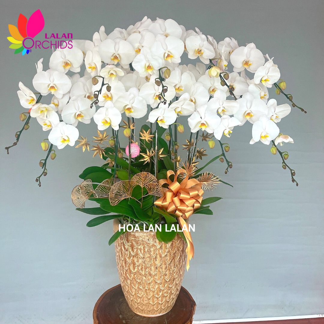 Chậu lan hồ điệp trắng 10 cành được các nghệ nhân của Hoa lan LaLan thiết kế một cách tỉ mỉ, tạo nên chậu hoa lan vô cùng đẹp và sang trọng.