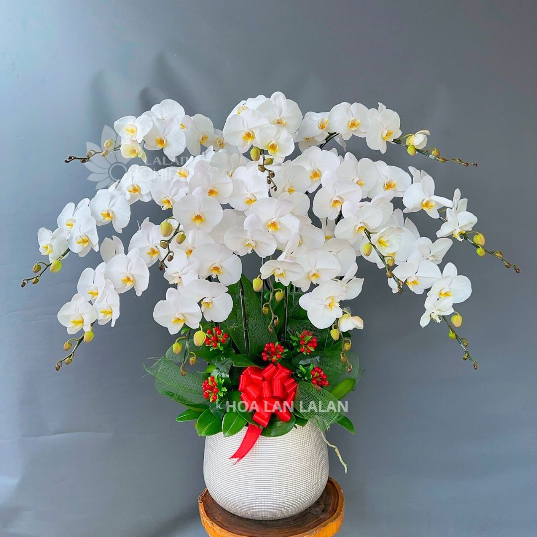 Lan hồ điệp được các nghệ nhân của Hoa lan Lalan ghép từ 12 cành lan hồ điệp trắng theo nghệ thuật một mặt hài hòa mang lại một vẻ đẹp sang trọng.