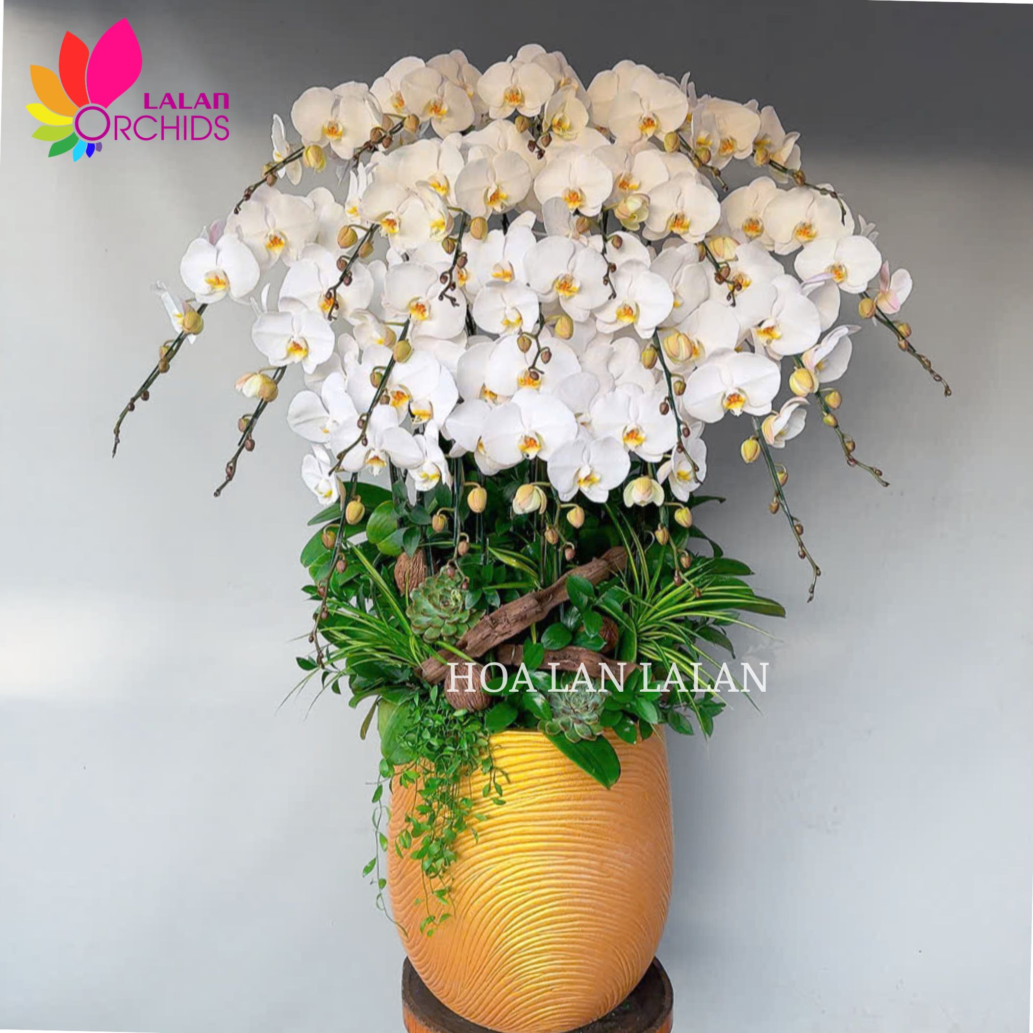 Chậu lan hồ điệp trắng được ghép từ 21 cành lan hồ điệp loại 1, chất lượng chuẩn Đài Loan với những cánh lan hồ điệp to dày, thân rễ chắc khỏe và siêu bền. Chậu lan hồ điệp được thiết kế sang trọng và tinh tế, bố cục hài hòa. Số lượng 21 cành lan hồ điệp – con số tượng trưng cho sự viên mãn, tròn đầy – làm tăng thêm giá trị ý nghĩa và sự đẳng cấp của mẫu chậu lan hồ điệp trắng.