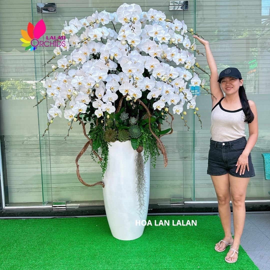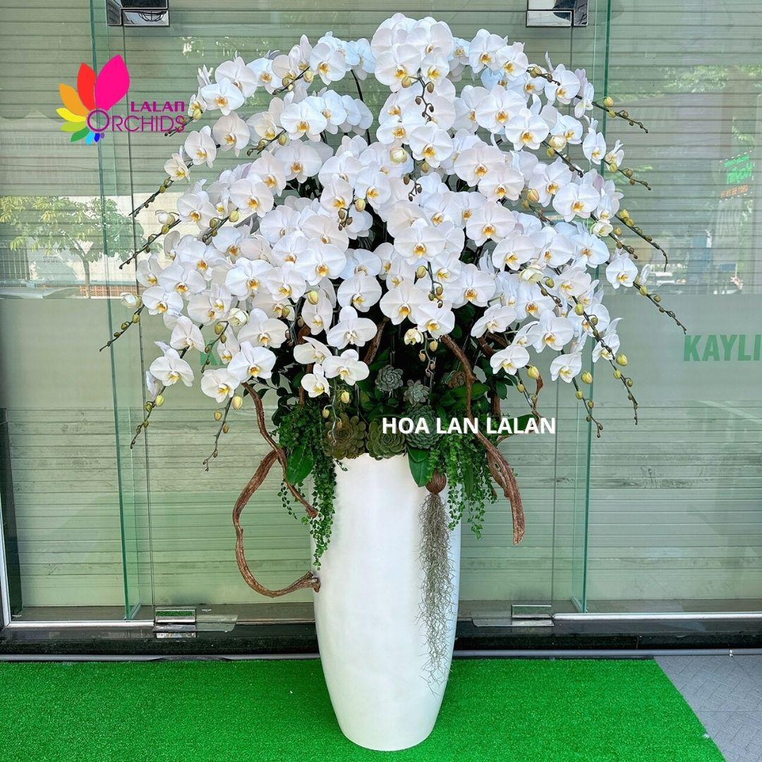 Hoa lan hồ điệp trắng chậu cao được kết hợp từ 30 cành lan trắng, được các nghệ nhân của Hoa lan Lalan cắm xen kẽ một cách hài hòa và sang trọng.