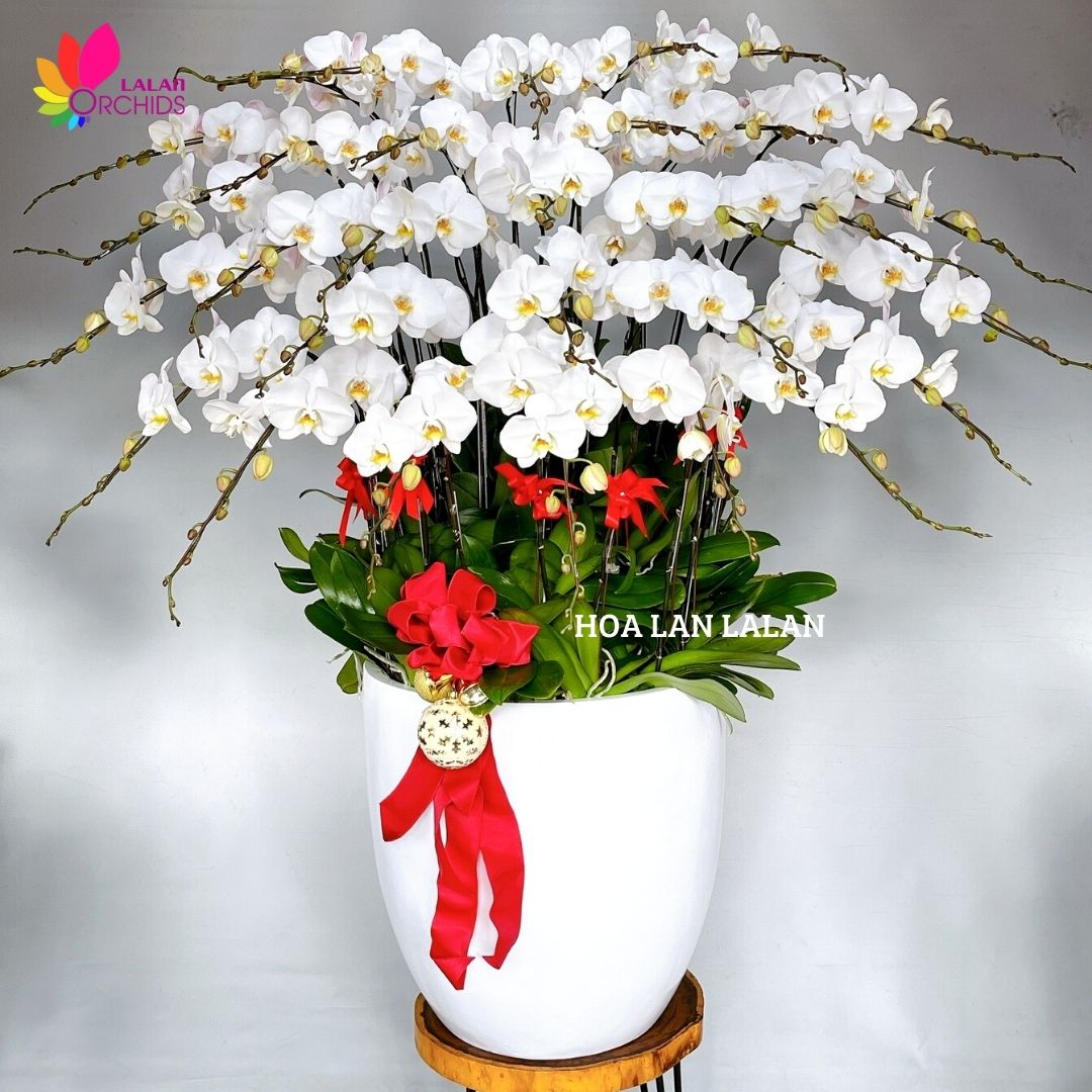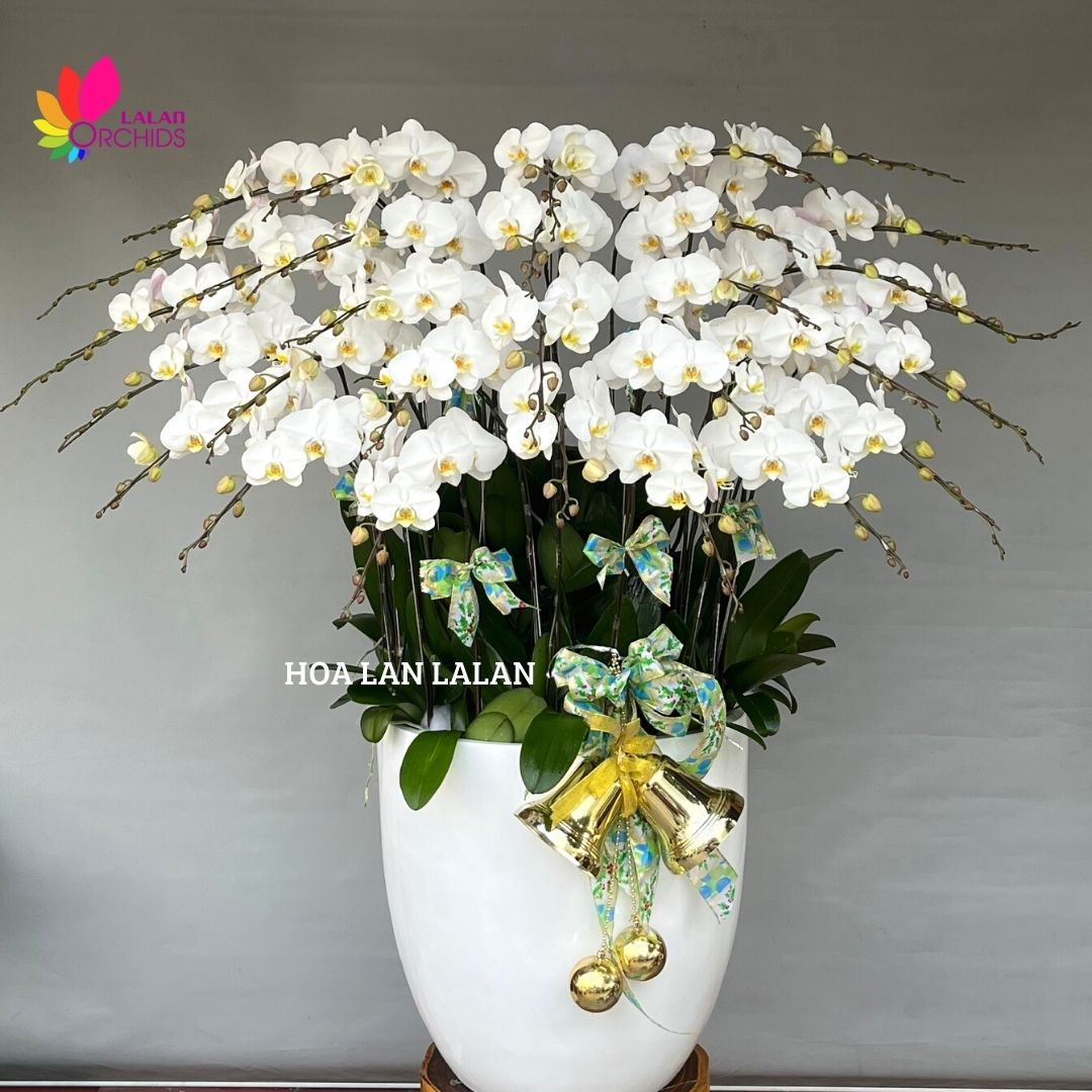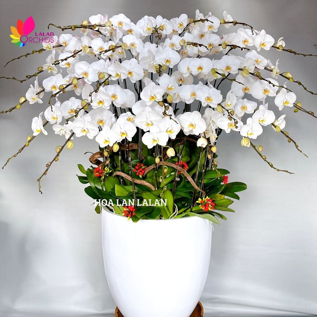 Lan hồ điệp trắng 30 cành sang trọng ghép từ những cành hoa lan chất lượng loại A với đặc điểm bông to, cành dài, siêu bền, được các nghệ nhân của Hoa lan Lalan ghép xen kẽ một cách hài hòa, nghệ thuật tạo nên chậu hoa lan đẹp sang trọng, quý phái và tinh tế.