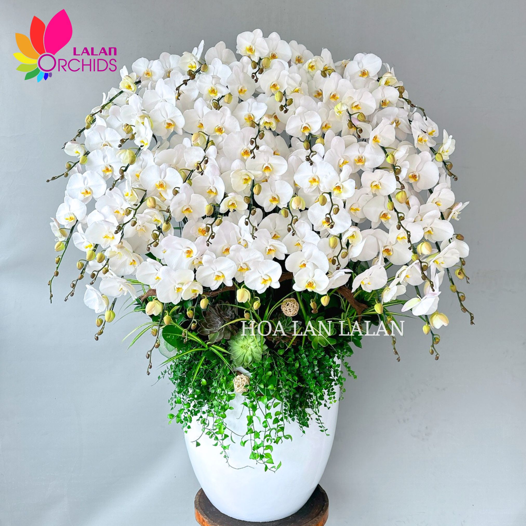 Sở hữu vẻ đẹp tinh khôi với những cánh lan hồ điệp trắng muốt, chậu lan hồ điệp trắng 36 cành được tạo hình cân đối, toát lên sự trang nhã và sang trọng. Những cành lan hồ điệp được sắp xếp khéo léo tạo thành bố cục tròn đầy tượng trưng cho sự viên mãn và thịnh vượng. Lan hồ điệp trắng trong phong thủy mang nguồn năng lượng tinh khiết, giúp cân bằng không gian sống. Chậu lan hồ điệp trắng 36 cành cũng biểu trưng cho sự may mắn và tài lộc dồi dào, đem đến nhiều thuận lợi cho gia chủ.