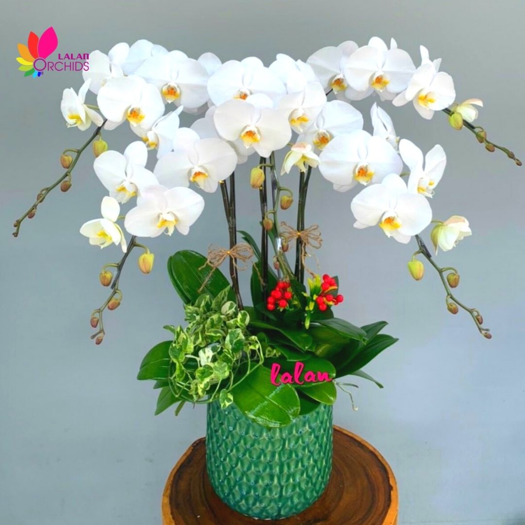 Lan hồ điệp 5 cành trắng tặng sinh nhật với các cánh hoa tròn đầy, dày bản và lá xanh tươi mọc đối xứng nhau. Cánh hoa mang vẻ tròn đầy nên được xem là biểu tượng của sự phồn vinh và giàu có. Đồng thời ý nghĩa lan hồ điệp màu trắng trong phong thuỷ còn là loài hoa tượng trưng cho sự may mắn và tài lộc, những cánh hoa và lá của lan được sắp xếp đối xứng, thể hiện sự cân bằng trong cuộc sống.