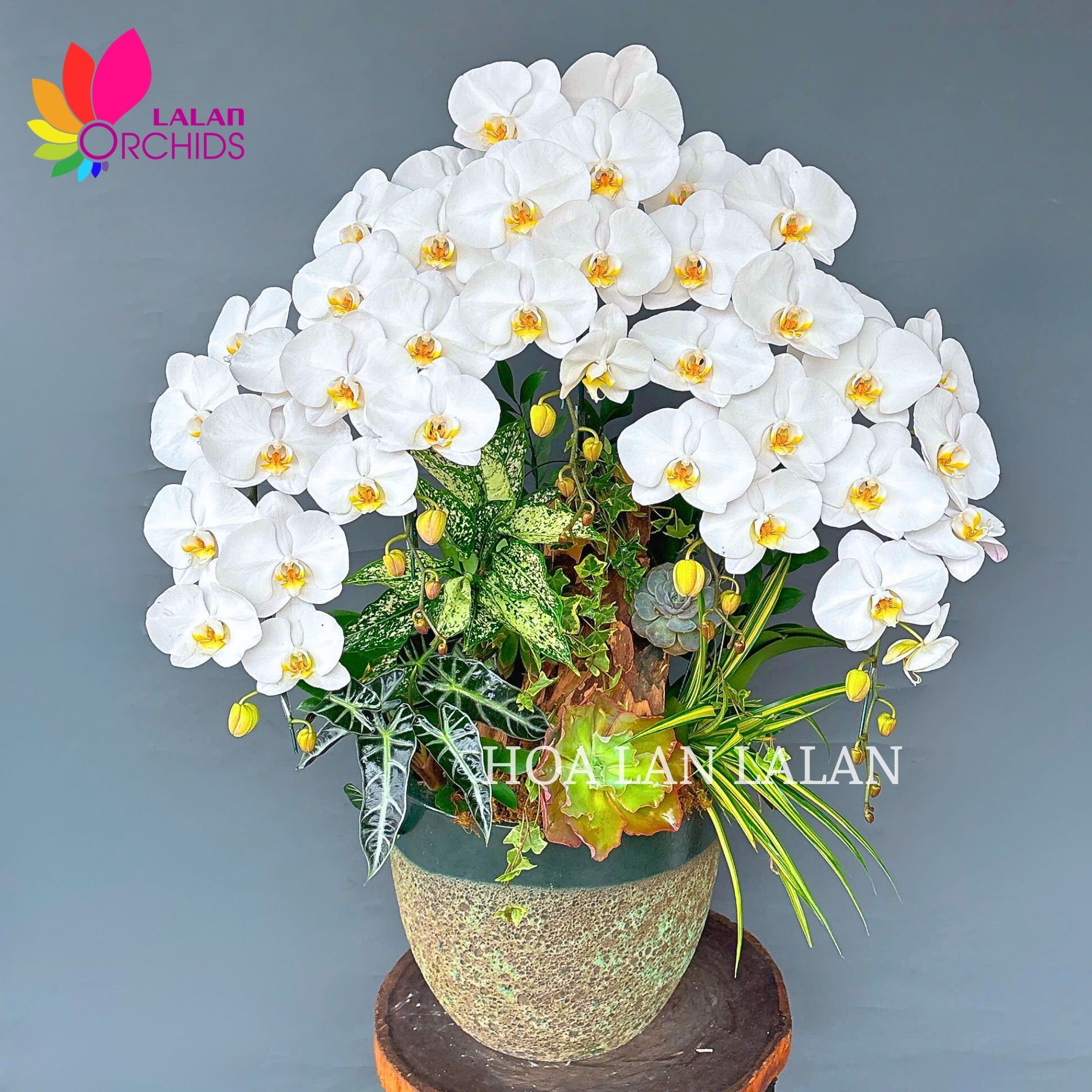 Mẫu chậu lan hồ điệp trắng 5 cành ghép tiểu cảnh độc lạ