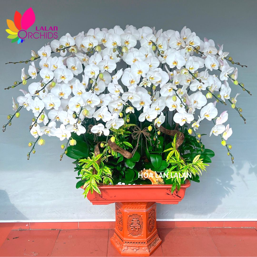 Chậu lan hồ điệp trắng 26 cành được các nghệ nhân của hoa lan Lalan ghép một các sang trọng và độc đáo theo nghệ thuật bonsai.