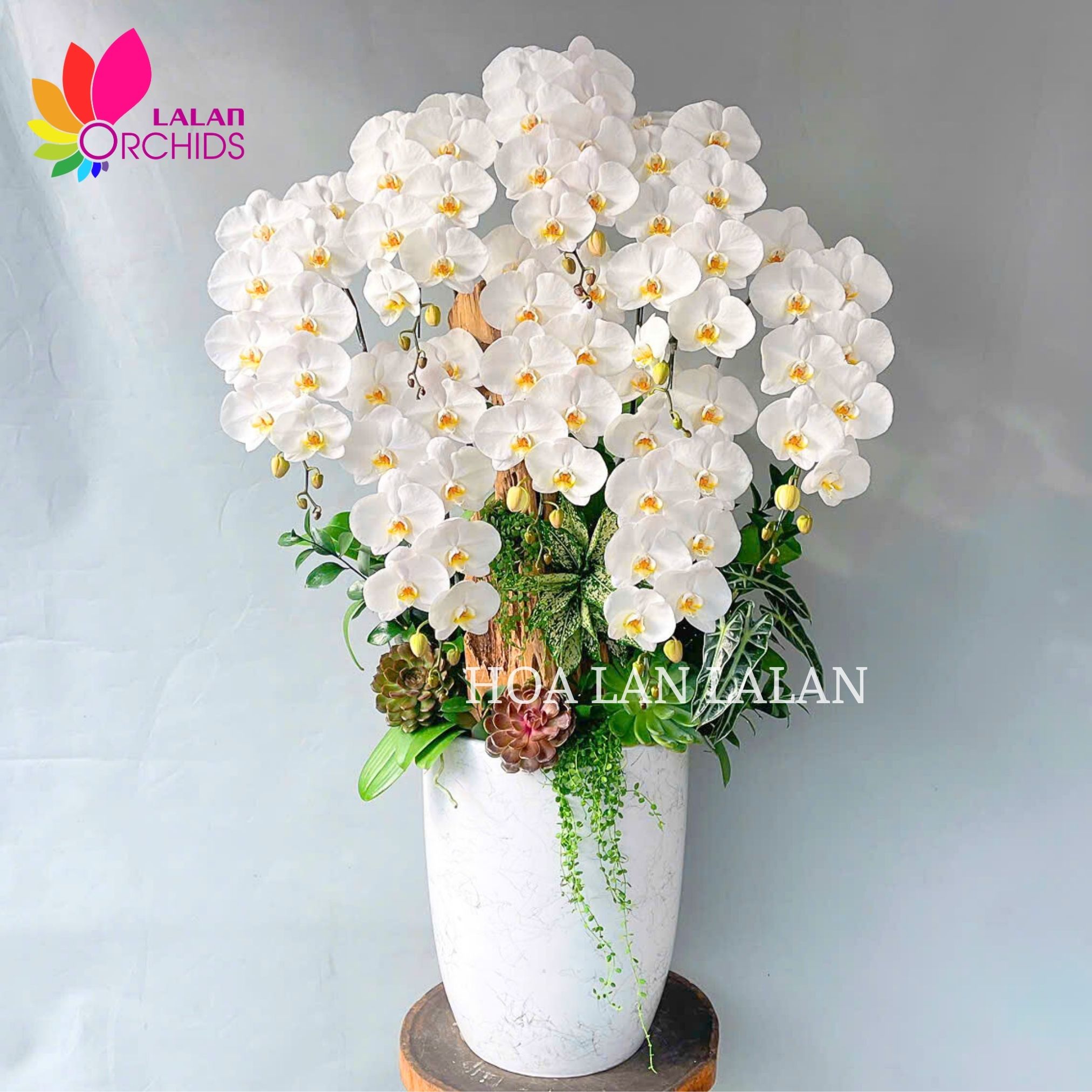 Tựa như những cánh bướm đang khẽ đậu giữa không gian tinh khôi, chậu lan hồ điệp trắng cắm kiểu mang trong mình vẻ đẹp thanh thoát và tao nhã đến lạ. Mỗi cánh lan hồ điệp trắng muốt, mịn màng như sứ, vươn cao kiêu hãnh trên thân gỗ uyển chuyển, tạo nên tổng thể cân đối, sang trọng và đầy khí chất.