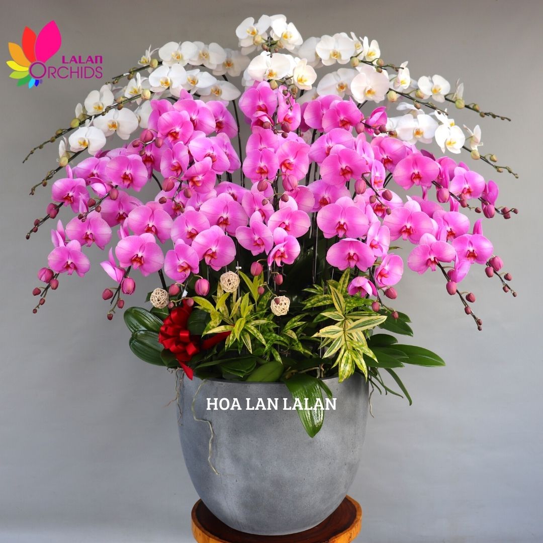 Lan hồ điệp trắng, hồng 27 cành ghép từ những cành hoa lan chất lượng loại A với đặc điểm bông to, cành dài, siêu bền, được các nghệ nhân của Hoa lan Lalan ghép xen kẽ một cách hài hòa, nghệ thuật tạo nên chậu hoa lan đẹp sang trọng, quý phái và tinh tế.