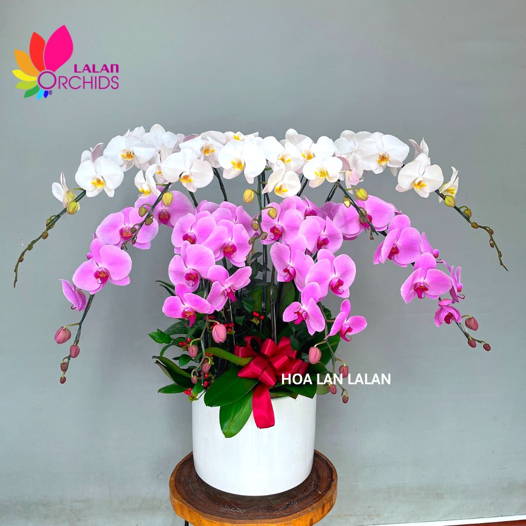 Lan hồ điệp trắng có ý nghĩa biểu tượng cho sự tinh khiết, thánh thiện và sang trọng. Lan hồ điệp hồng thể hiện lên sự dịu dàng, duyên dáng trong từng cánh hoa. Sự kết hợp hai màu hoa tạo nên vẻ đẹp sang trọng và tinh tế, làm cuốn hút mọi ánh nhìn.