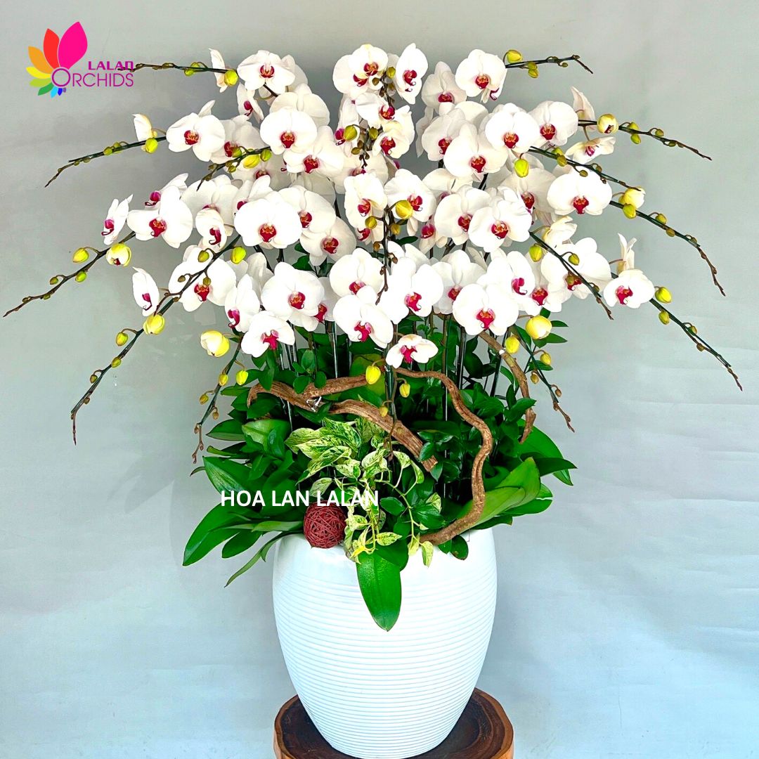 Lan hồ điệp trắng lưỡi đỏ 18 cành ghép từ những cành hoa lan chất lượng loại A với đặc điểm bông to, cành dài, siêu bền, được các nghệ nhân của Hoa lan Lalan ghép xen kẽ một cách hài hòa, nghệ thuật tạo nên chậu hoa lan đẹp sang trọng, quý phái và tinh tế.