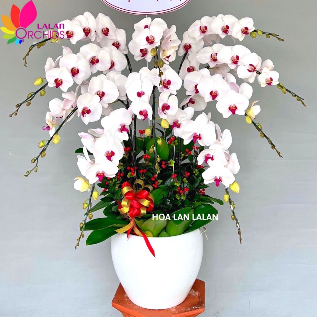 Lan hồ điệp trắng 10 cành sang trọng, ghép từ những cành hoa lan chất lượng loại A với đặc điểm bông to, cành dài, siêu bền, được các nghệ nhân của Hoa lan Lalan ghép xen kẽ một cách hài hòa, nghệ thuật tạo nên chậu hoa lan đẹp sang trọng, quý phái và tinh tế.
