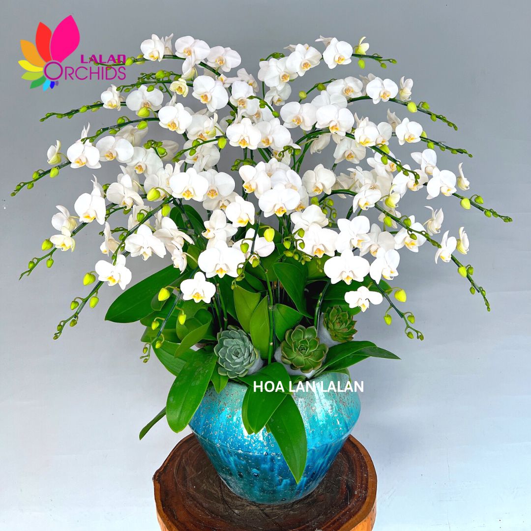 Lan hồ điệp mini trắng được ghép từ 10 cây lan hồ điệp mini loại 2 vòi, được các nghệ nhân của Hoa lan Lalan ghép xen kẽ một cách hài hòa, nghệ thuật tạo nên chậu hoa lan đẹp sang trọng, quý phái và tinh tế.