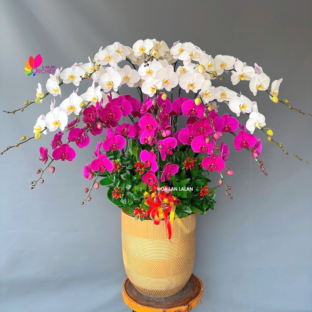 Lan hồ điệp màu trắng, tím 18 cành với vẻ đẹp thanh lịch và sang trọng, thường được sử dụng để trang trí các không gian trong nhà, văn phòng, hay cả trong các sự kiện quan trọng.