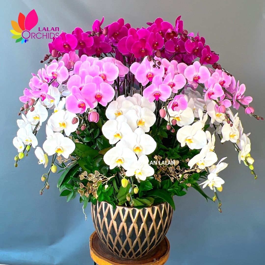 Hoa lan hồ điệp màu trắng, với vẻ đẹp thuần khiết và thanh lịch, biểu tượng cho sự thuần khiết và tinh khôi. Hoa lan hồ điệp tím mang vẻ đẹp đài cát, kiêu sa. Hoa hồ điệp hồng, với vẻ đẹp quyến rũ và nữ tính, thêm vào sự ấn tượng của chậu hoa, tạo nên một tác phẩm vô cùng độc đáo và sang trọng.