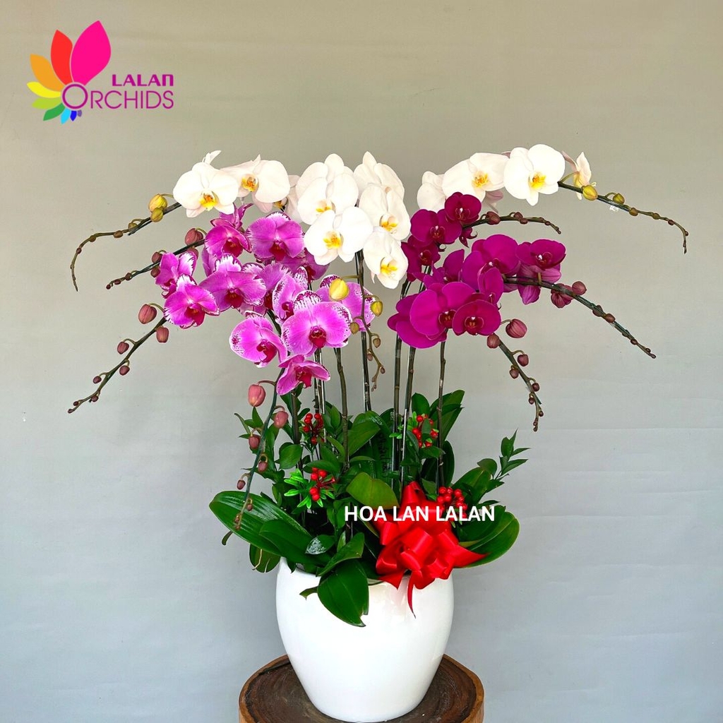Chậu hoa lan hồ điệp trắng tím hồng 9 cành ghép từ những cành lan hồ điệp chất lượng loại A với đặc điểm bông to, cành dài, siêu bền, được các nghệ nhân của Hoa lan Lalan ghép xen kẽ một cách hài hòa, nghệ thuật tạo nên chậu hoa lan đẹp sang trọng, quý phái và tinh tế.