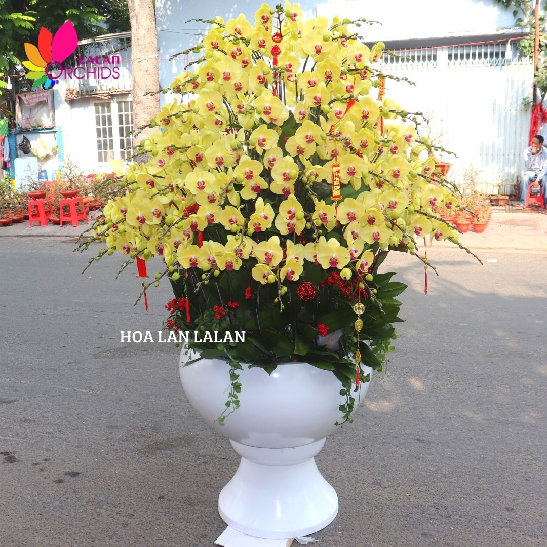 Chậu hoa lan hồ điệp vàng 100 cành vô cùng thích hợp để chưng trong những không gian lớn. Với vẻ đẹp rực rỡ và sang trọng, chậu lan sẽ là nguồn lan tỏa năng lượng tích cực đến cho gia chủ trong những dịp khai trương, sinh nhật hay dịp tết đến xuân về.