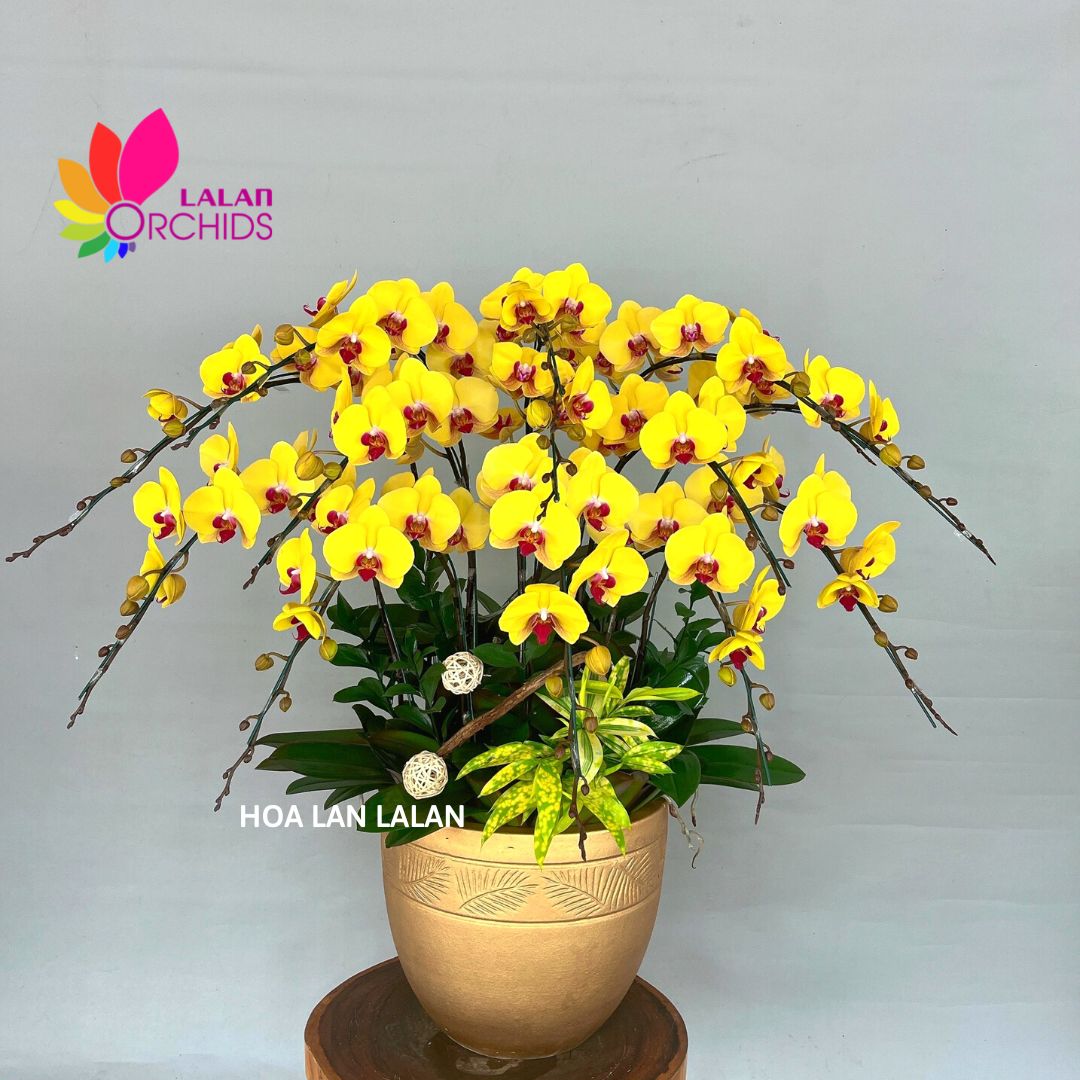 Lan hồ điệp vàng 13 cành được các nghệ nhân của Hoa lan Lalan ghép xen kẽ một cách hài hòa, nghệ thuật tạo nên chậu hoa lan đẹp sang trọng, quý phái và tinh tế.