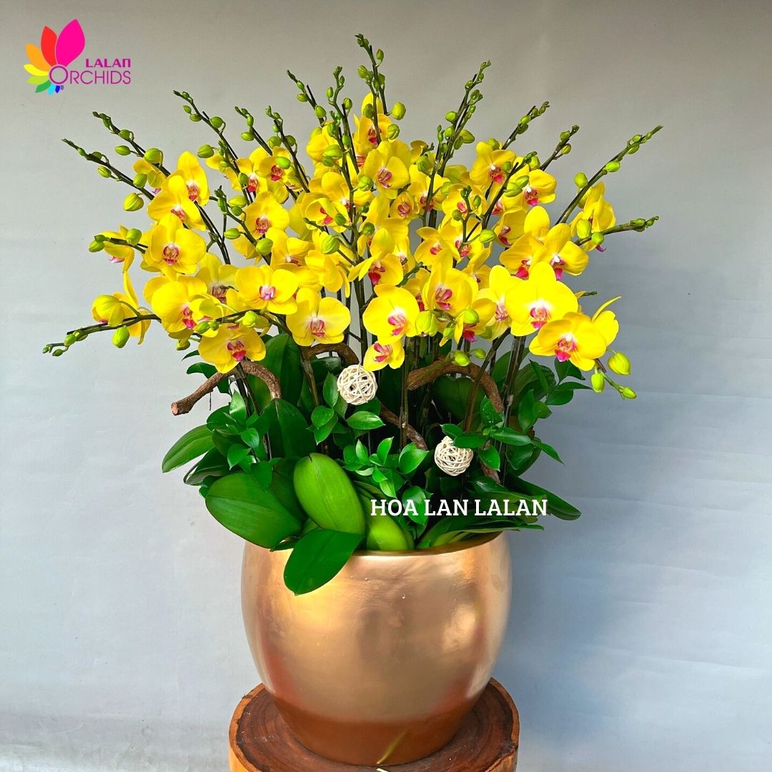 Lan hồ điệp vàng 13 cây (loại 2 vòi) được các nghệ nhân của Hoa lan Lalan ghép xen kẽ một cách hài hòa, nghệ thuật tạo nên chậu hoa lan đẹp sang trọng, quý phái và tinh tế.