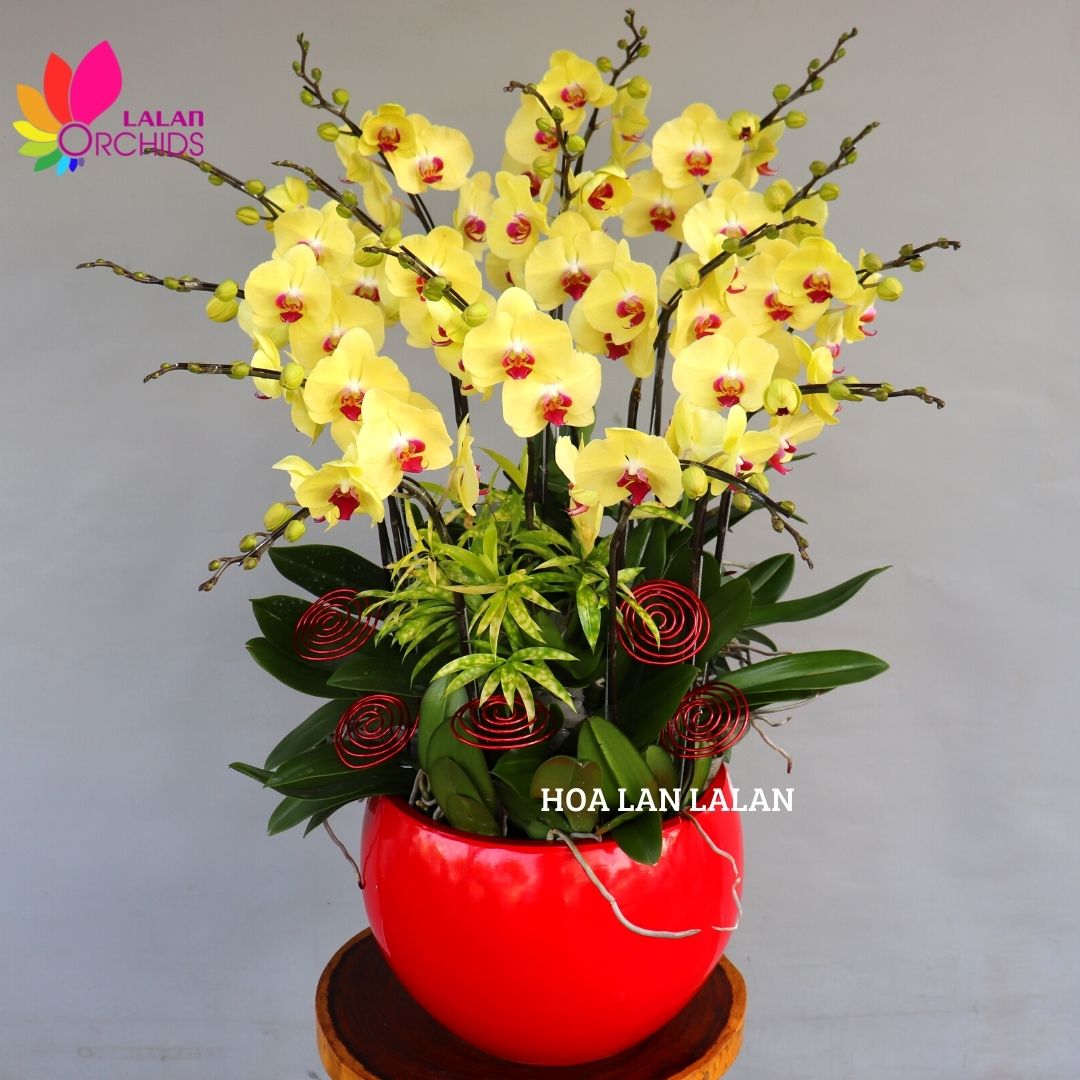 Lan hồ điệp vàng 15 cành ghép từ những cành hoa lan chất lượng loại A với đặc điểm bông to, cành dài, siêu bền, được các nghệ nhân của Hoa lan Lalan ghép xen kẽ một cách hài hòa, nghệ thuật tạo nên chậu hoa lan đẹp sang trọng, quý phái và tinh tế.