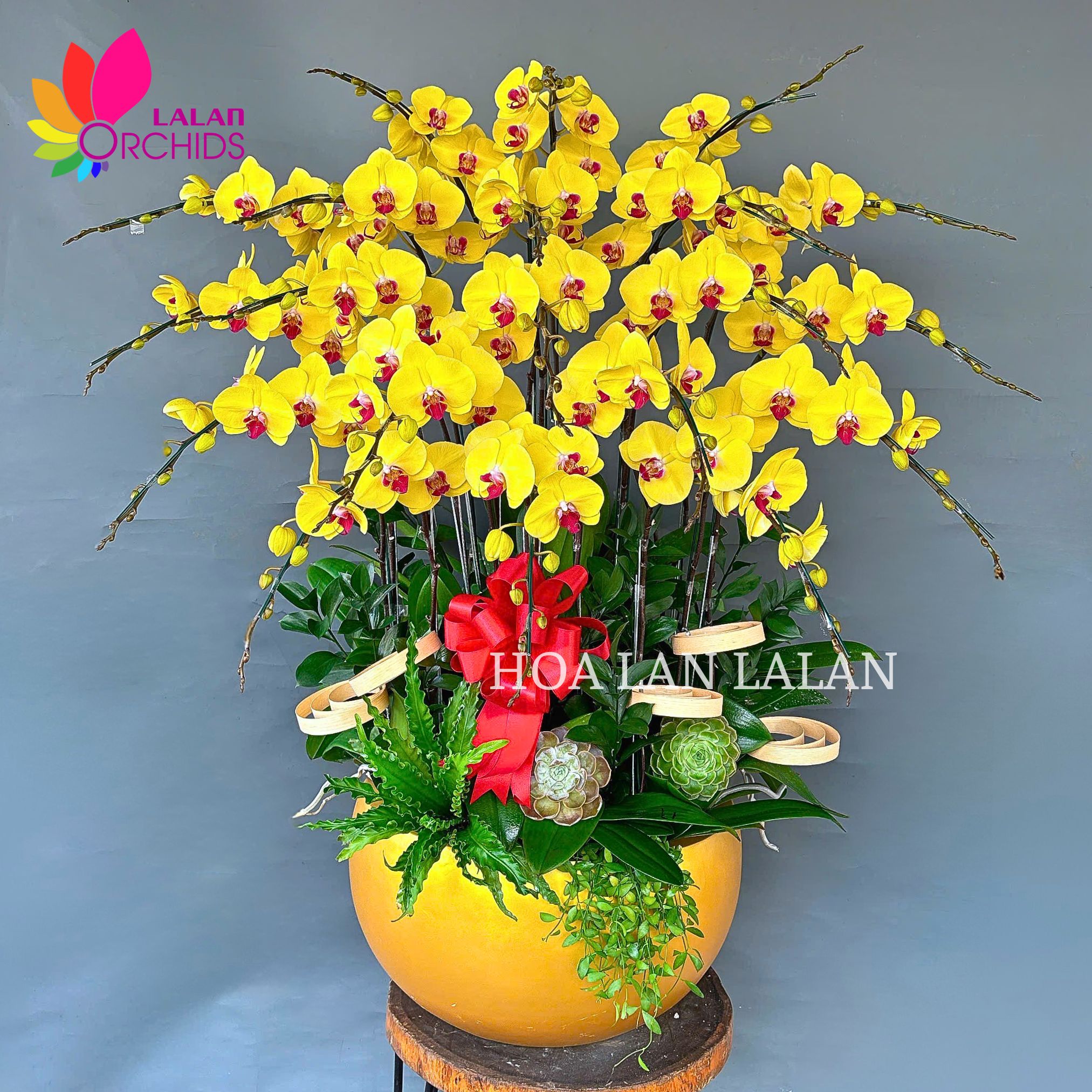 Chậu lan hồ điệp vàng 20 cành là lựa chọn hoàn hảo cho những dịp khai trương, tặng sinh nhật hay các dịp kỷ niệm, dịp năm mới, phù hợp chưng bày nơi cần sự hiện diện của vẻ đẹp sang trọng, chỉn chu và đẳng cấp. Từng cành lan hồ điệp được Hoa lan Lalan tuyển chọn kỹ lưỡng, dáng hoa vươn cao cân đối, cánh hoa dày, sắc vàng tươi rực rỡ nhưng không chói gắt, tạo nên tổng thể hài hòa và cuốn hút ngay từ ánh nhìn đầu tiên. Vẻ đẹp của chậu lan hồ điệp không chỉ nằm ở màu sắc, mà còn ở thần thái sang trọng, bền bỉ, tượng trưng cho sự phát triển vững vàng và thịnh vượng lâu dài.