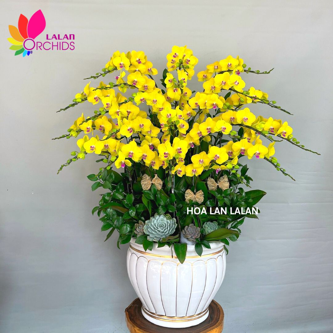 Chậu lan hồ điệp vàng được các nghệ nhân của Hoa lan LaLan ghép từ 22 cành lan hồ điệp theo phong cách một mặt, tạo nên chậu lan hồ điệp đẹp hài hòa và sang trọng.