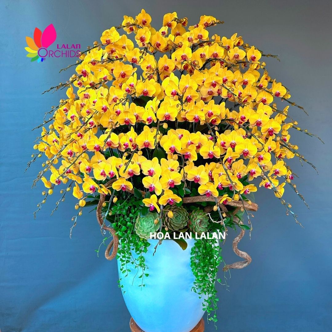 Hoa lan hồ điệp vàng có vẻ đẹp rực rỡ và sang trọng, biểu tượng cho sự cho sự giàu sang phú quý. Chậu hoa lan được ghép một cách hài hòa và độc đáo, tạo nên tác phẩm đẹp lộng lẫy, làm thu hút mọi ánh nhìn.