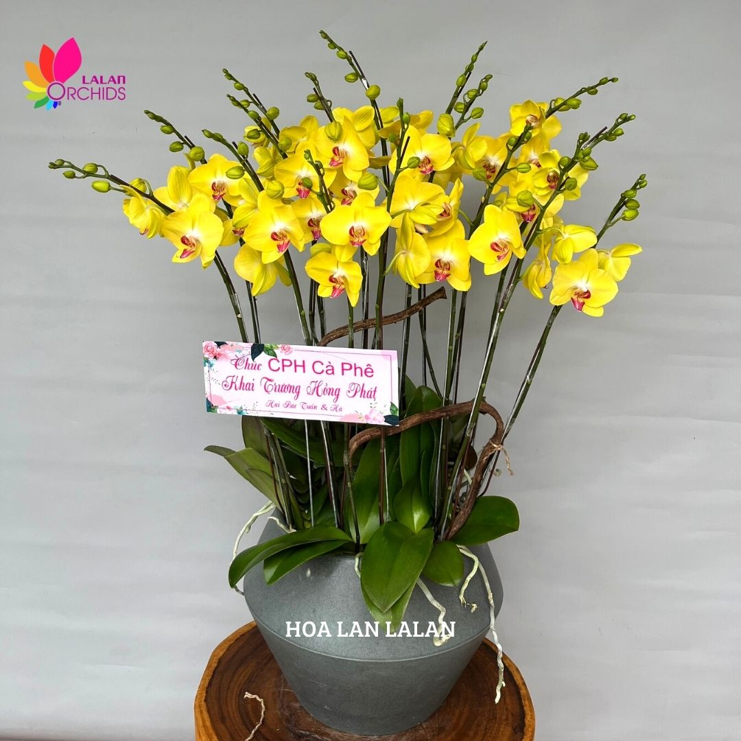 Lan hồ điệp vàng ấm áp ghép từ những cành hoa lan chất lượng loại A với đặc điểm bông to, cành dài, siêu bền, được các nghệ nhân của Hoa lan Lalan ghép xen kẽ một cách hài hòa, nghệ thuật tạo nên chậu hoa lan đẹp sang trọng, quý phái và tinh tế.