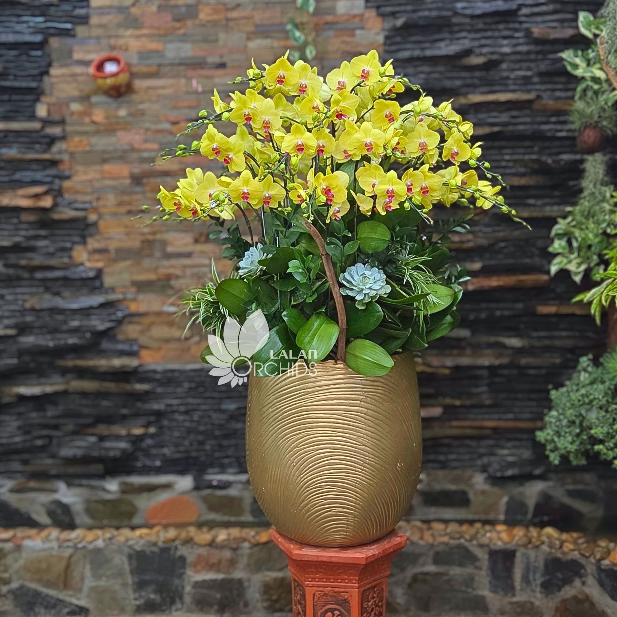 Chậu lan hồ điệp vàng cắm xoay tròn mang vẻ đẹp của sự sang trọng với những chuyển động tinh tế. Kỹ thuật cắm hoa 360 độ giúp cành hoa tỏa đều, khoe sắc rực rỡ ở mọi góc nhìn tượng trưng cho vòng tuần hàn tài lộc, sự nghiệp hanh thông và phú quý viên mãn.