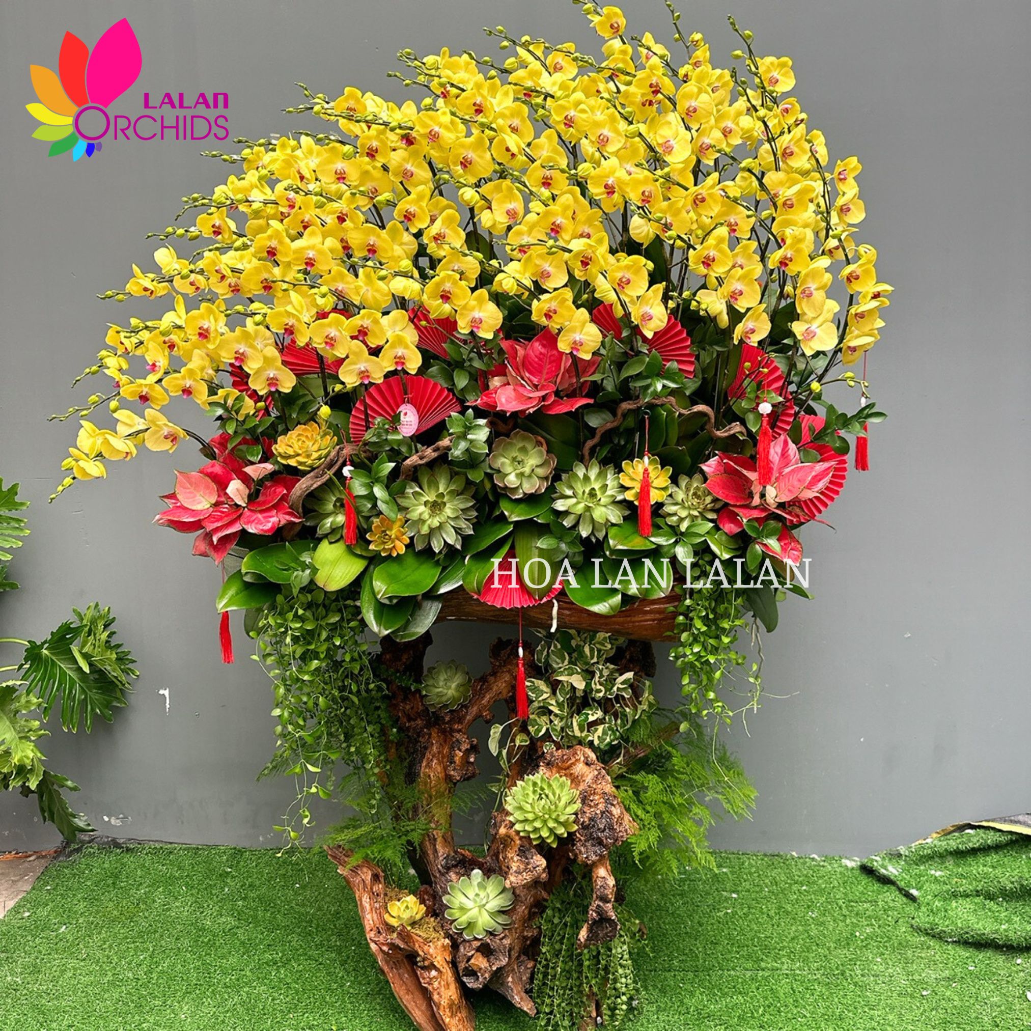 Tác phẩm lan hồ điệp vàng kim giáp ghép trên gỗ lũa, được tạo hình thành cánh buồm vượt gió mang vẻ đẹp tự nhiên đầy mê hoặc. Sắc vàng kim của lan hồ điệp gợi lên sự giàu sang, phú quý. Gỗ lũa tự nhiên làm phần chậu là điểm tựa nâng đỡ lan hồ điệp, giúp lan hồ điệp tỏa sáng và nổi bật. Tác phẩm lan hồ điệp vàng kim giáp ghép lũa qua bàn tay khép léo và tư duy thẩm mỹ cao của thợ hoa LALAN trở thành tác phẩm nghệ thuật sống động khiến ai chiêm ngưỡng cũng phải trầm trồ.