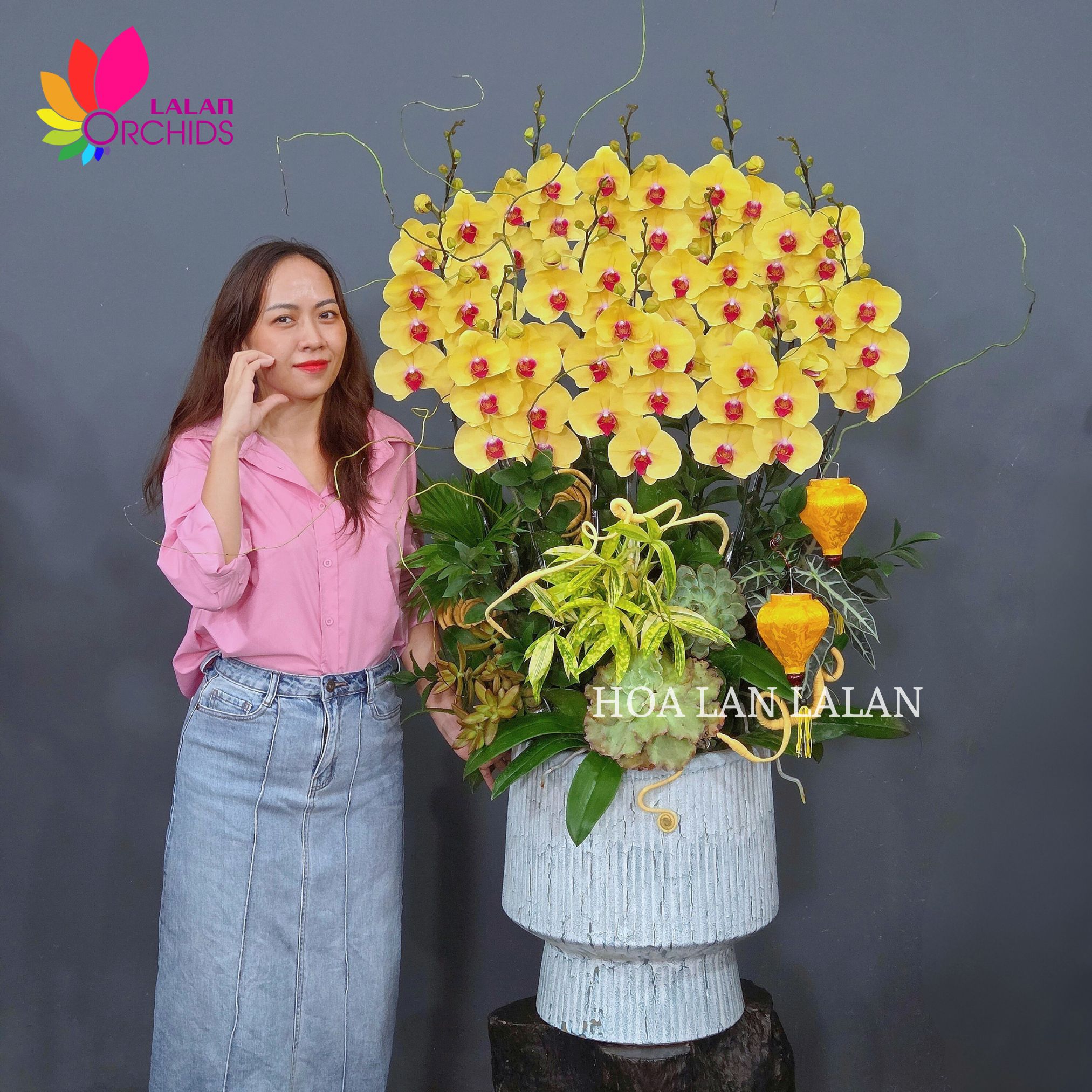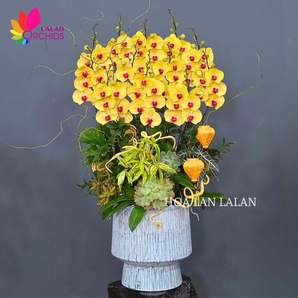 Chậu lan hồ điệp được phối cùng hệ lá xanh và tiểu cảnh tinh tế, kết hợp bình trụ đá màu trung tính, giúp tôn lên vẻ đẹp tự nhiên của hoa lan mà vẫn giữ nét trang nhã, hiện đại. Sản phẩm đặc biệt phù hợp trưng bày ngày Tết, sảnh tiếp khách hoặc làm quà chúc mừng với ý nghĩa tài lộc dồi dào – công việc hanh thông – khởi sự thuận lợi.