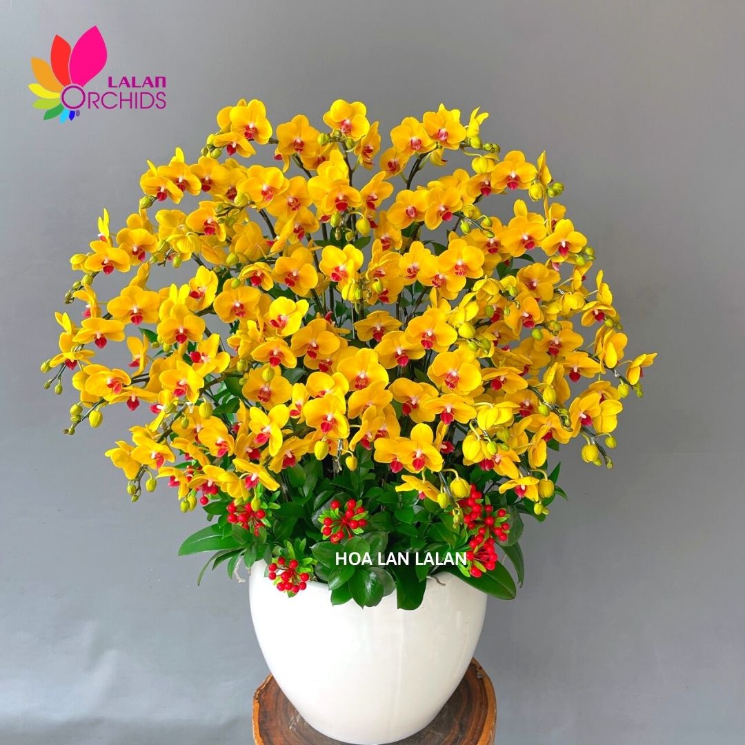Lan hồ điệp vàng sung túc được kết hợp từ 16 cây lan hồ điệp loại 2 vòi kết thành 36 cành lan, được những người thợ có tay nghề cao của Hoa lan Lalan thiết kế một cách tỉ mỉ và nghệ thuật, tạo nên chậu lan hồ điệp sang trọng, quyến rũ và tinh tế.