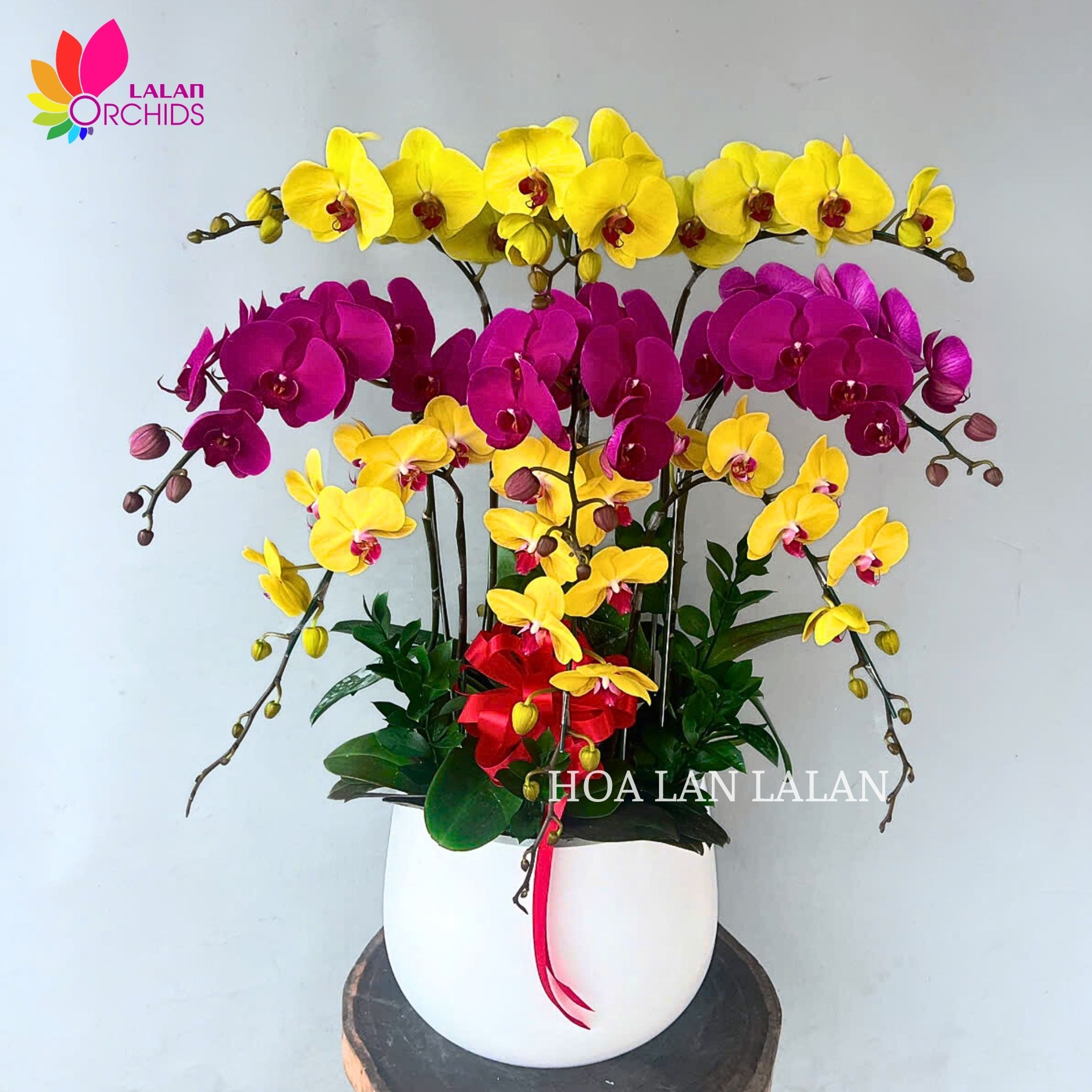 Chậu lan hồ điệp vàng tím 9 cành khoác trên mình chiếc áo của sự kiêu sa, quý phái của lan hồ điệp tím và sắc vàng rực rỡ, sang trọng. Đây là món quà tuyệt vời để tặng vào các dịp lễ lớn như Tết, mừng sinh nhật, hoặc các sự kiện quan trọng như kỷ niệm ngày cưới, tân gia, khai trương. Sự hiện diện của chậu hoa lan hồ điệp không chỉ thể hiện lòng tri ân mà còn thay lời chúc may mắn, hạnh phúc và thành công tới người nhận.