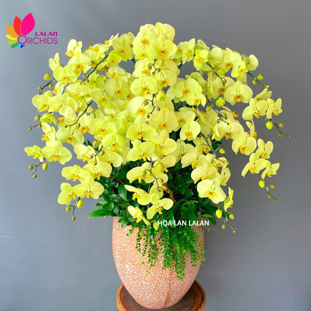 Lan hồ điệp màu xanh bơ với 18 cành là một tác phẩm tuyệt vời, được các nghệ nhân của Hoa Lan Lalan ghép hài hòa và độc đáo.