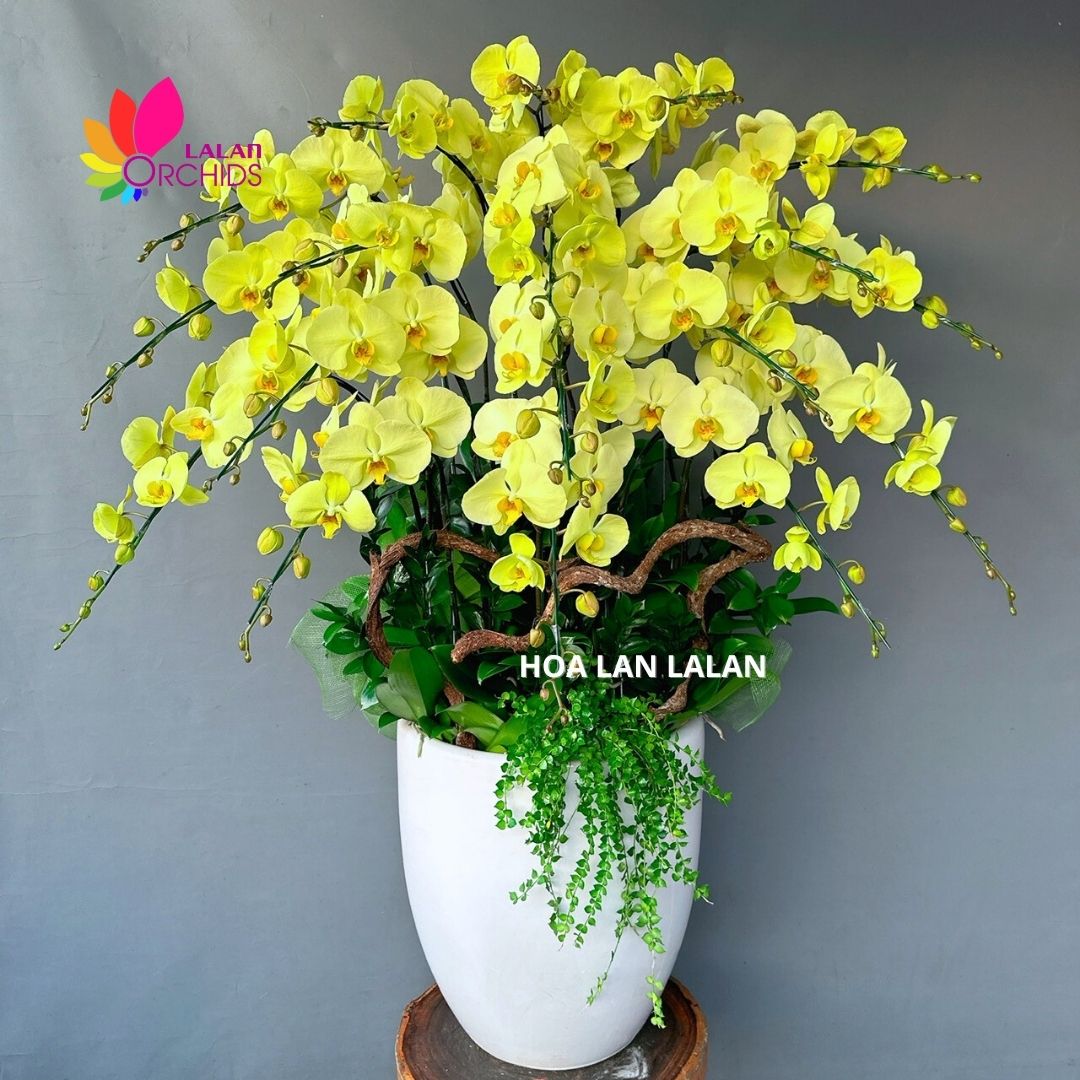 Chậu lan hồ điệp xanh táo được ghép từ 18 cành hoa lan chất lượng loại A với đặc điểm bông to, cành dài, siêu bền, được các nghệ nhân của Hoa lan Lalan ghép xen kẽ một cách hài hòa, nghệ thuật tạo nên chậu hoa lan đẹp sang trọng, quý phái và tinh tế.