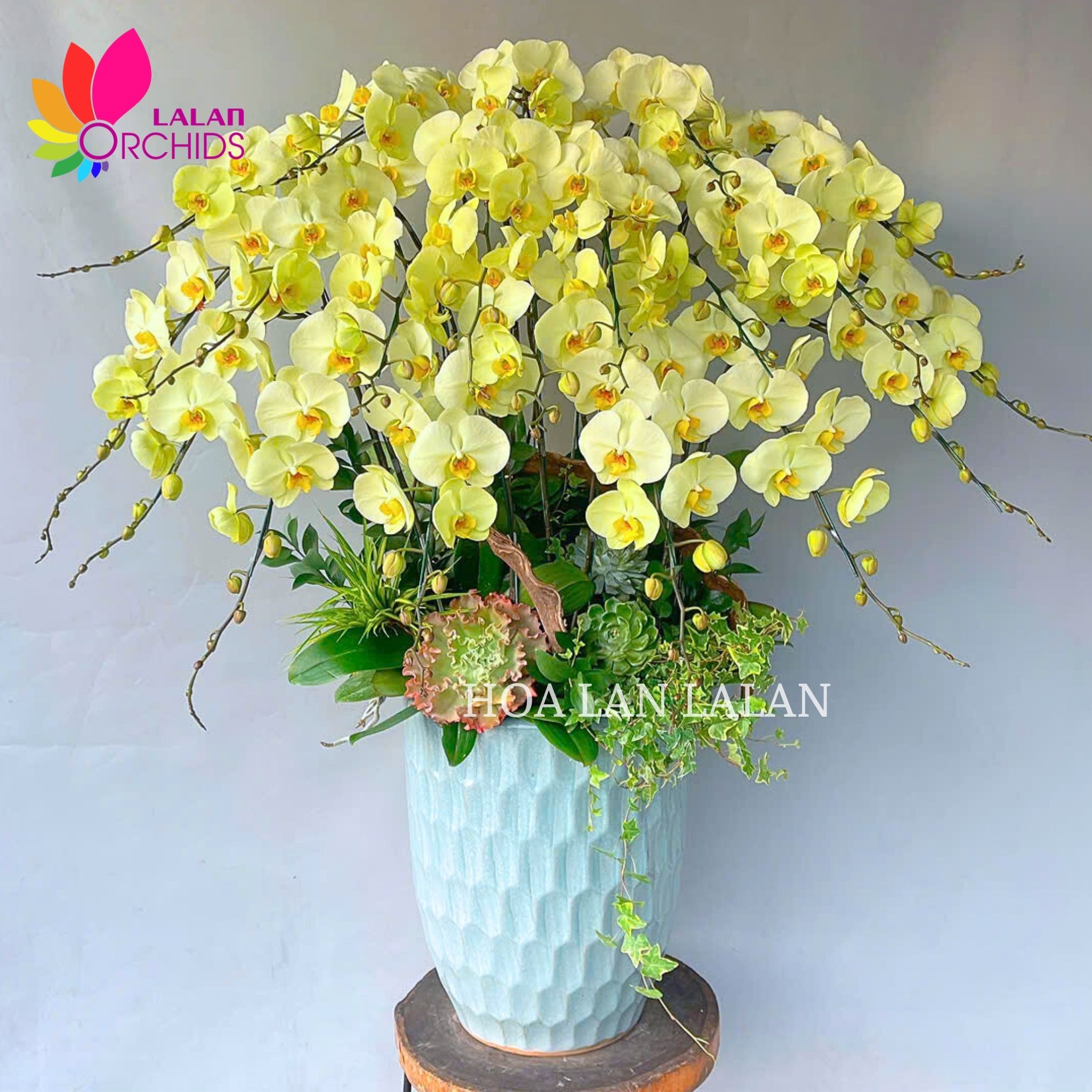 Mẫu lan hồ điệp xanh táo 20 cành cao cấp gây ấn tượng ngay từ ánh nhìn đầu tiên bởi sắc xanh thanh nhã, cuốn hút. Những cánh lan hồ điệp dày dặn, font hoa đều, sắc xanh táo tươi mát hòa cùng nhụy vàng rực rỡ tạo nên tổng thể sang trọng, khác biệt nhưng không phô trương. Thiết kế chậu lan hồ điệp được Hoa lan Lalan hoàn thiện tỉ mỉ với bố cục cân đối, dáng vươn cao thanh thoát, kết hợp với sen đá cây xanh trang trí đơn giản mà tinh tế. Tổng thể chậu lan hồ điệp xnah toát lên sự sang trọng xứng tầm trong không gian lơn như phòng tiếp khách, sảnh công ty, phòng hội nghị hay khu vực tiếp khách cao cấp. Chậu hoa lan sẽ không chỉ là vật trang trí mà còn là điểm nhấn thẩm mỹ thể hiện gu chọn hoa tinh tế của người sở hữu.