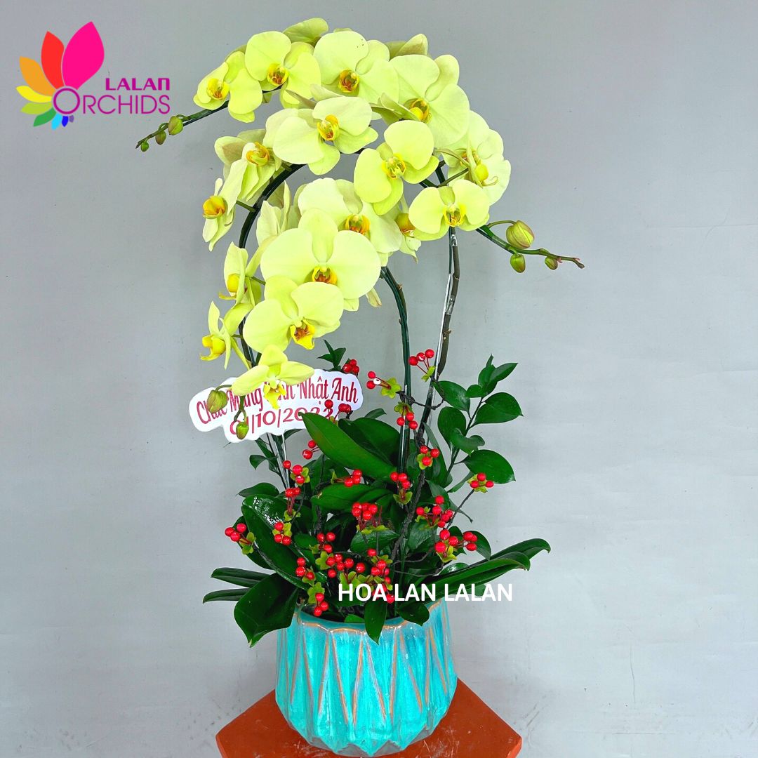 Lan hồ điệp xanh táo 3 cành được các nghệ nhân của Hoa lan Lalan ghép xen kẽ một cách hài hòa, nghệ thuật tạo nên chậu hoa lan đẹp sang trọng, quý phái và tinh tế.