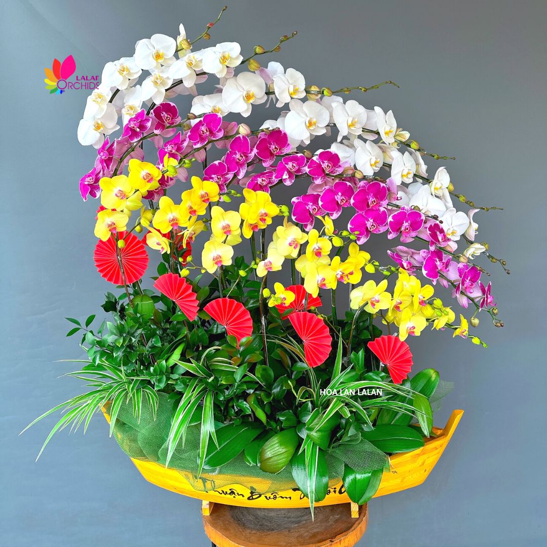 Thuyền hoa lan hồ điệp với 21 cành trắng tím vàng với sự kết hợp tinh tế giữa lan hồ điệp và thuyền gỗ mang lại vẻ đẹp tuyệt vời và ý nghĩa tinh thần đặc biệt.