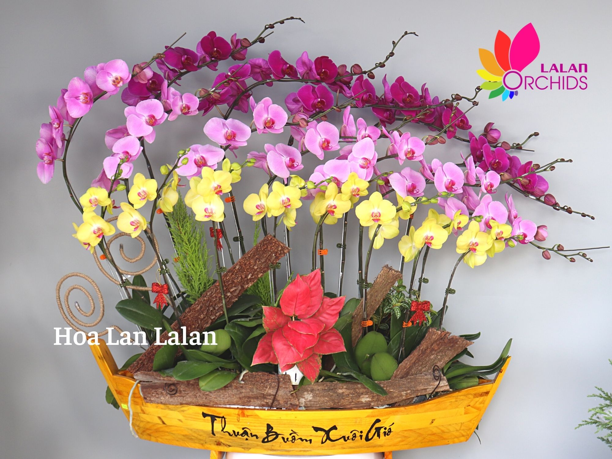 Thuyền lan hồ điệp thuận buồm xuôi gió ghép từ 25 cành lan hồ điệp màu vàng, hồng và tím. Được các nghệ nhân của Hoa lan Lalan ghép một cách tỉ mĩ và nghệ thuật, tạo nên thuyền hoa Lan hồ điệp đẹp sang trọng, đẳng cấp và tinh tế.