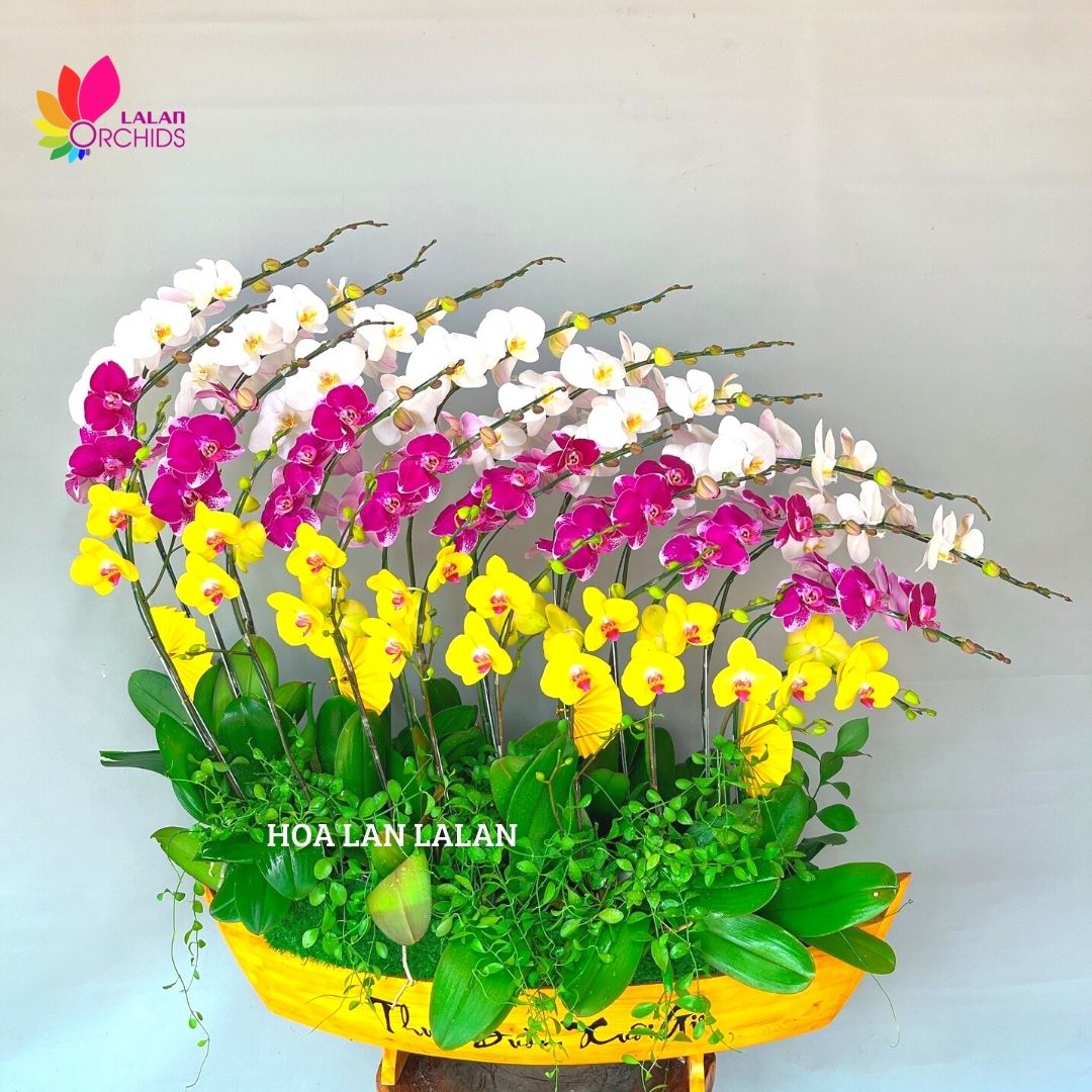 Thuyền lan hồ điệp ghép từ 24 cành lan hồ điệp màu trắng, tím và vàng. Được các nghệ nhân của Hoa lan Lalan ghép một cách tỉ mĩ và nghệ thuật, tạo nên thuyền hoa Lan hồ điệp tuyệt đẹp, sang trọng và tinh tế.