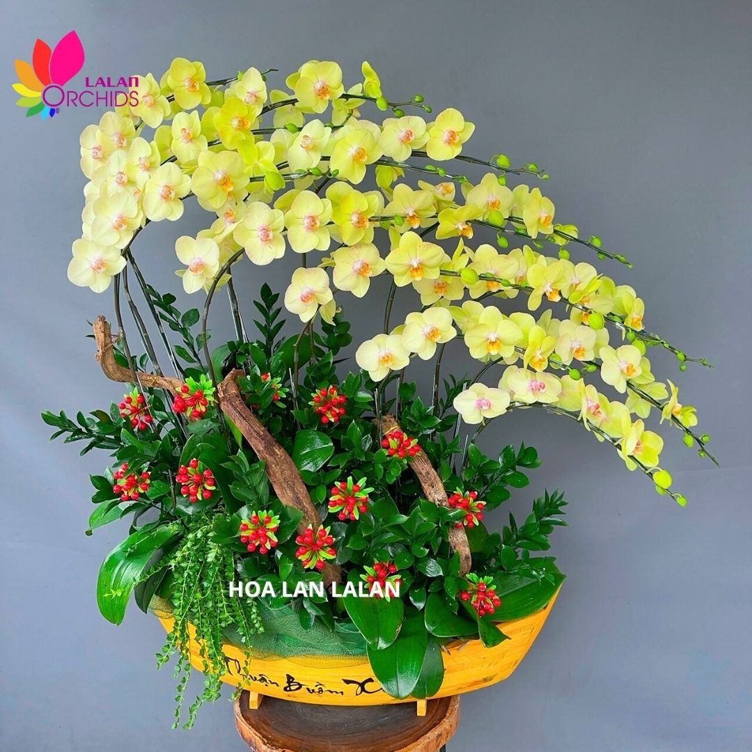Thuyền lan hồ điệp màu vàng cốm được kết hợp bởi 15 cành lan cùng thuyền gỗ một cách hài hòa mang đến vẻ đẹp làm say đắm lòng người.