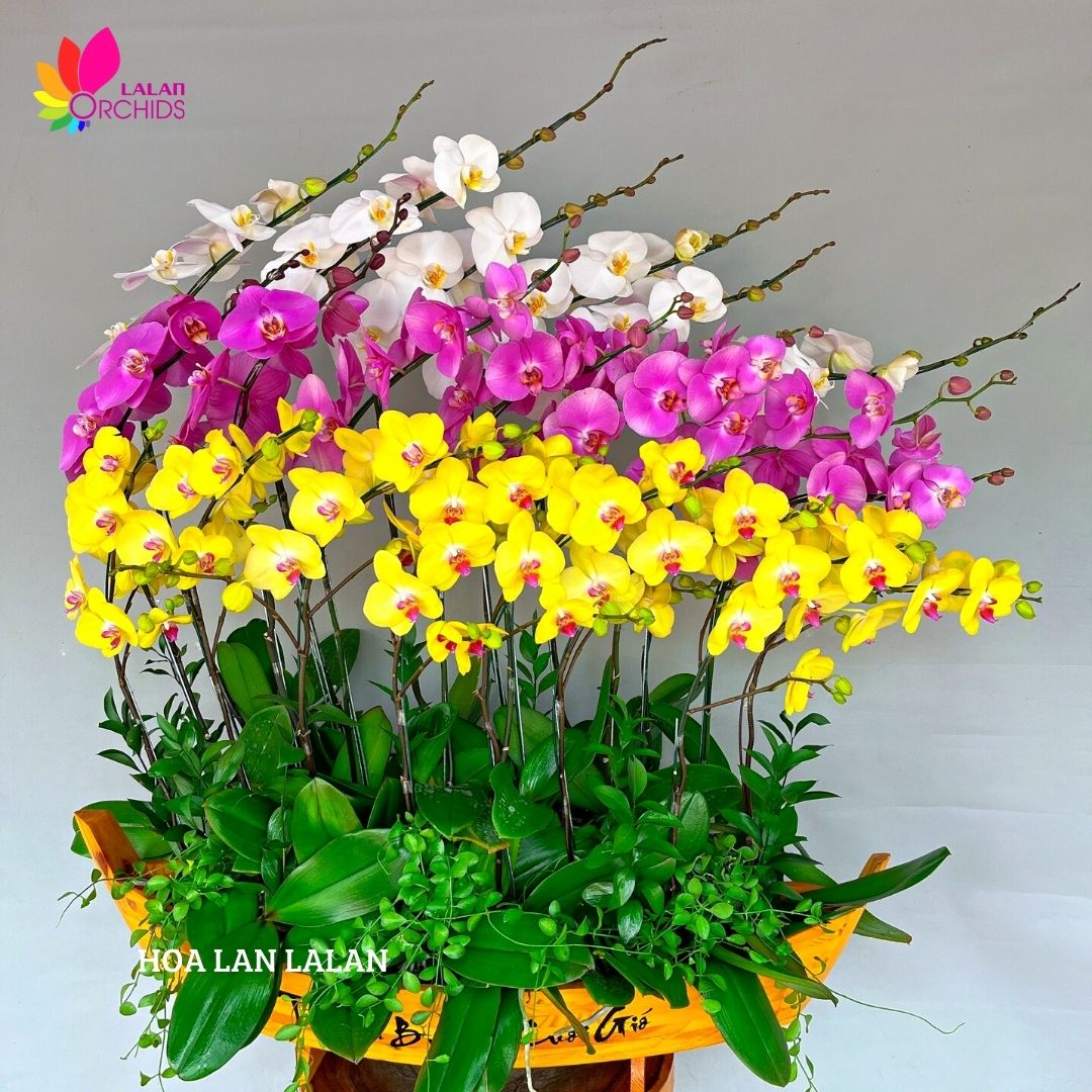 Thuyền lan hồ điệp thuận buồm xuôi gió ghép từ 21 cành lan hồ điệp màu trắng, hồng và vàng. Được các nghệ nhân của Hoa lan Lalan ghép một cách tỉ mĩ và nghệ thuật, tạo nên thuyền hoa Lan hồ điệp đẹp sang trọng, đẳng cấp và tinh tế.