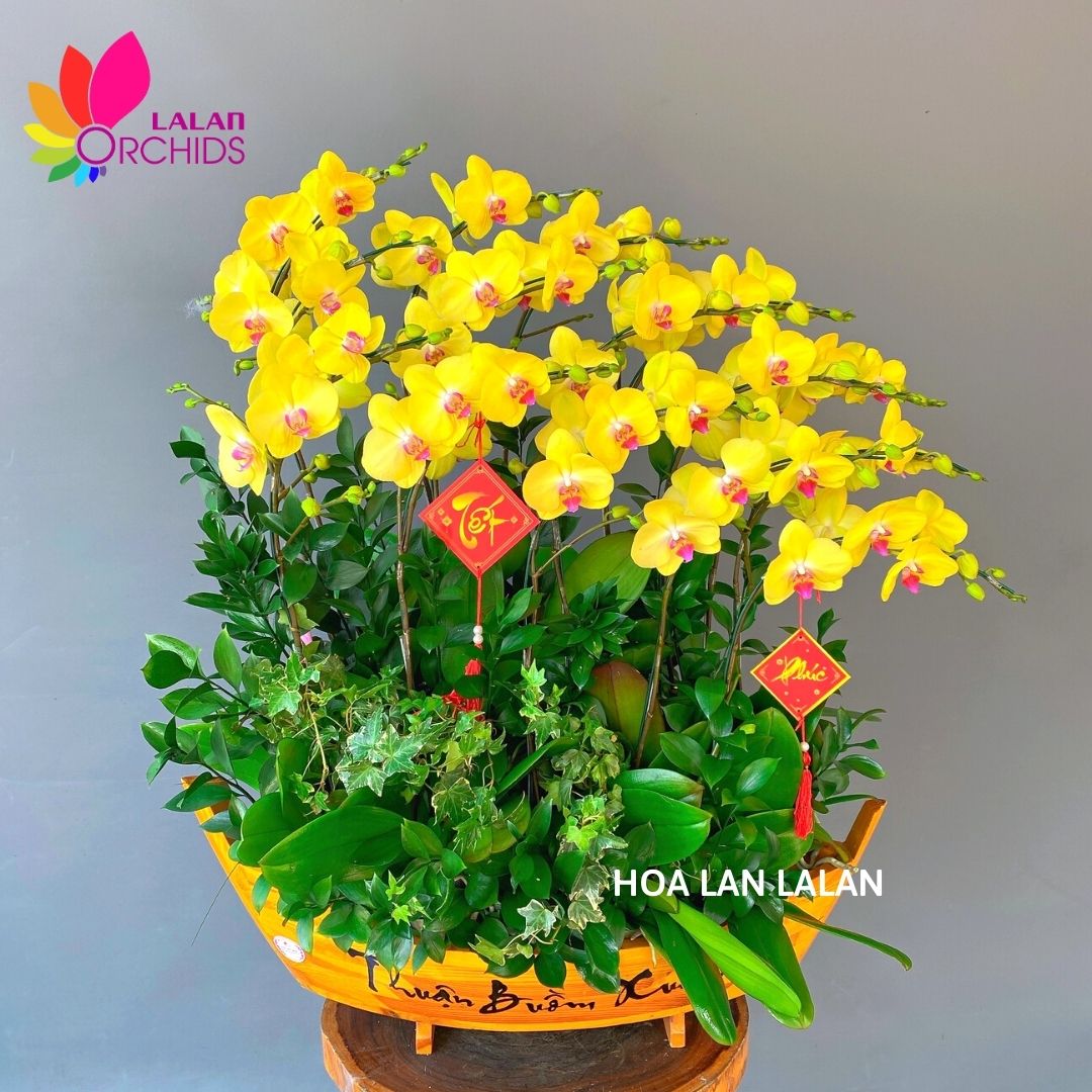 Thuyền Lan Hồ Điệp 15 cành màu vàng là một trong những tác phẩm nghệ thuật độc đáo của Hoa Lan LaLan. Được các nghệ nhân sáng tạo kết hợp giữa lan hồ điệp và thuyền gỗ, thuyền hoa Lan Hồ Điệp mang đến vẻ đẹp sang trọng và đầy phong thủy.